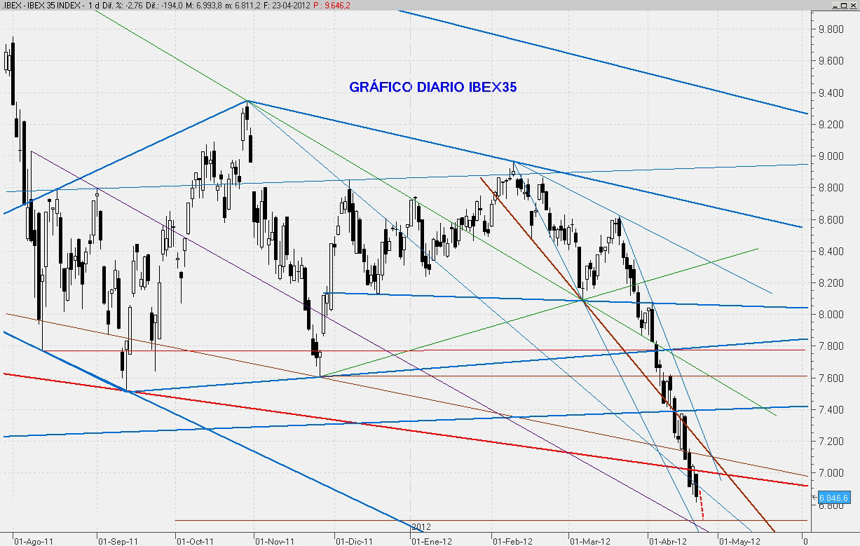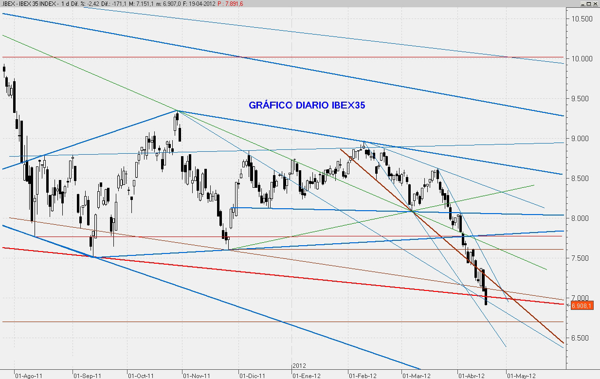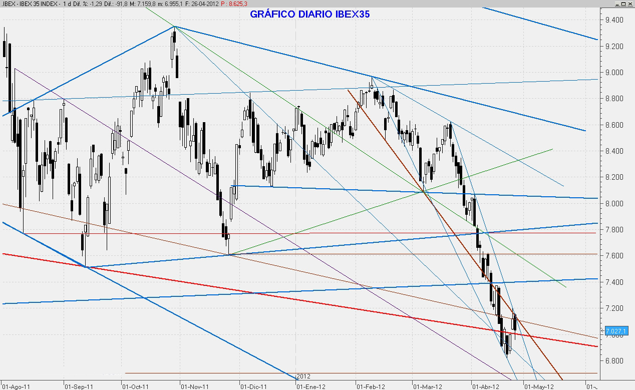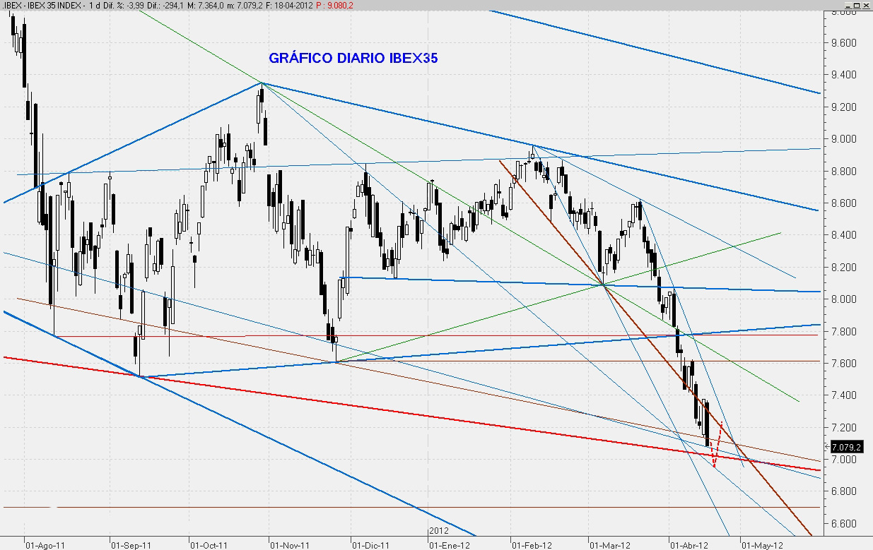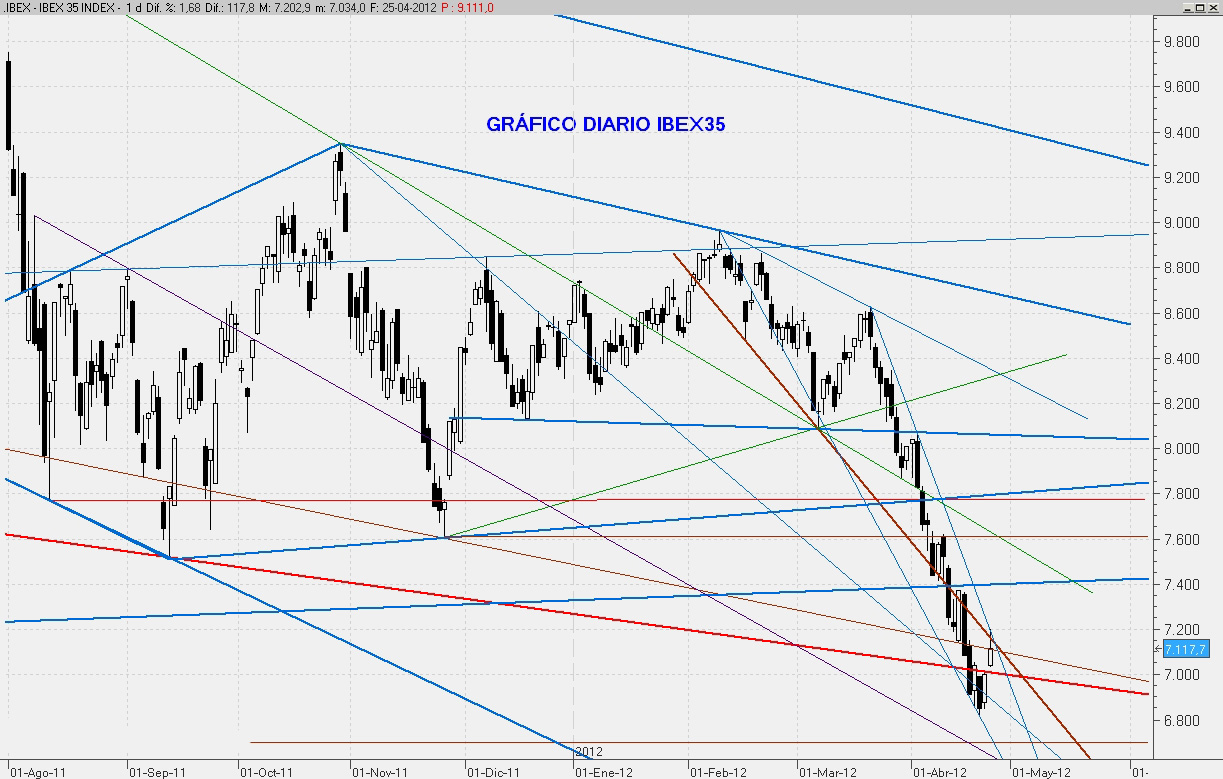 Como siempre el mercado no nos pone las cosas fáciles a los inversores y por el momento el ansiado rebote no va a ser un movimiento limpio hacia arriba sino en forma de zig-zag. El Ibex ha tocado esta mañana los 7.200 puntos que saben a poco y ha corregido con fuerza. Según mi opinión, viendo el cierre mensual de hoy parece claro que en Mayo veremos nuevos mínimos pero esto no quita para que antes de retomar las caídas el mercado intente de nuevo continuar con el rebote hacia los 7.400 puntos.