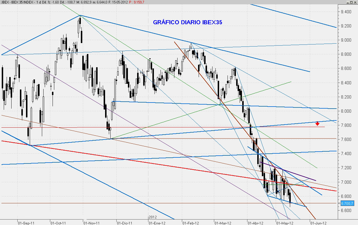 Nuevo mínimo anual en la sesión de hoy con un euro que se va por el desagüe. Mañana se prevee otra sesión dura con nuevos mínimos en el «Ibex contado», con lo que el rebote dibujado ayer desde el 6.700 pierde validez.