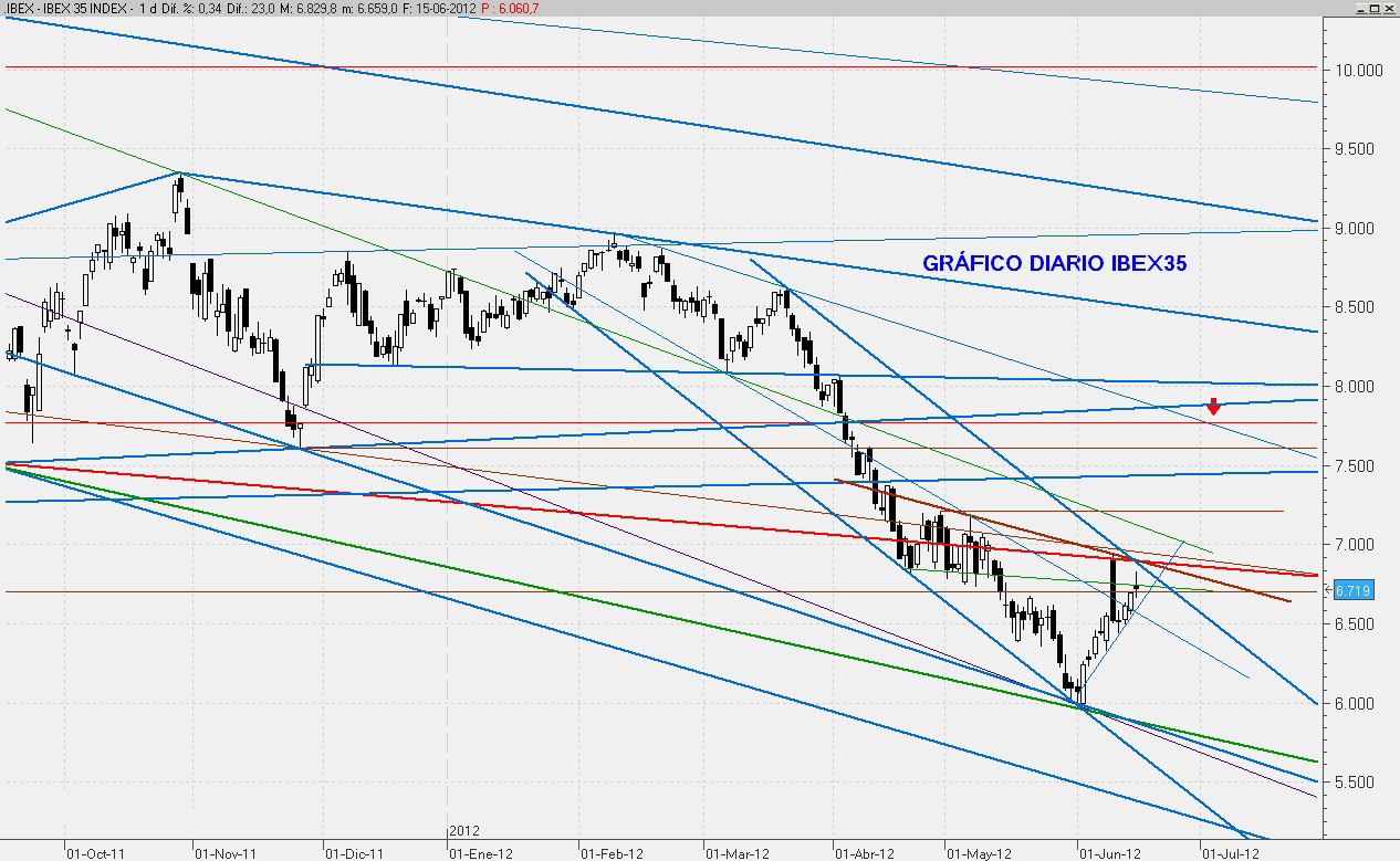Llegó el día y ahora sólo falta conocer los resultados para ver si Grecia tiene aún posibilidades de mantenerse en el Euro o por contra, toma la kamikaze decisión de ir por libre. Técnicamente hablando lo único que puedo decir es que, como comenté el Martes pasado, no deberíamos alejarnos mucho del 6.550 que puede ser el objetivo de cierre del mes de Junio.