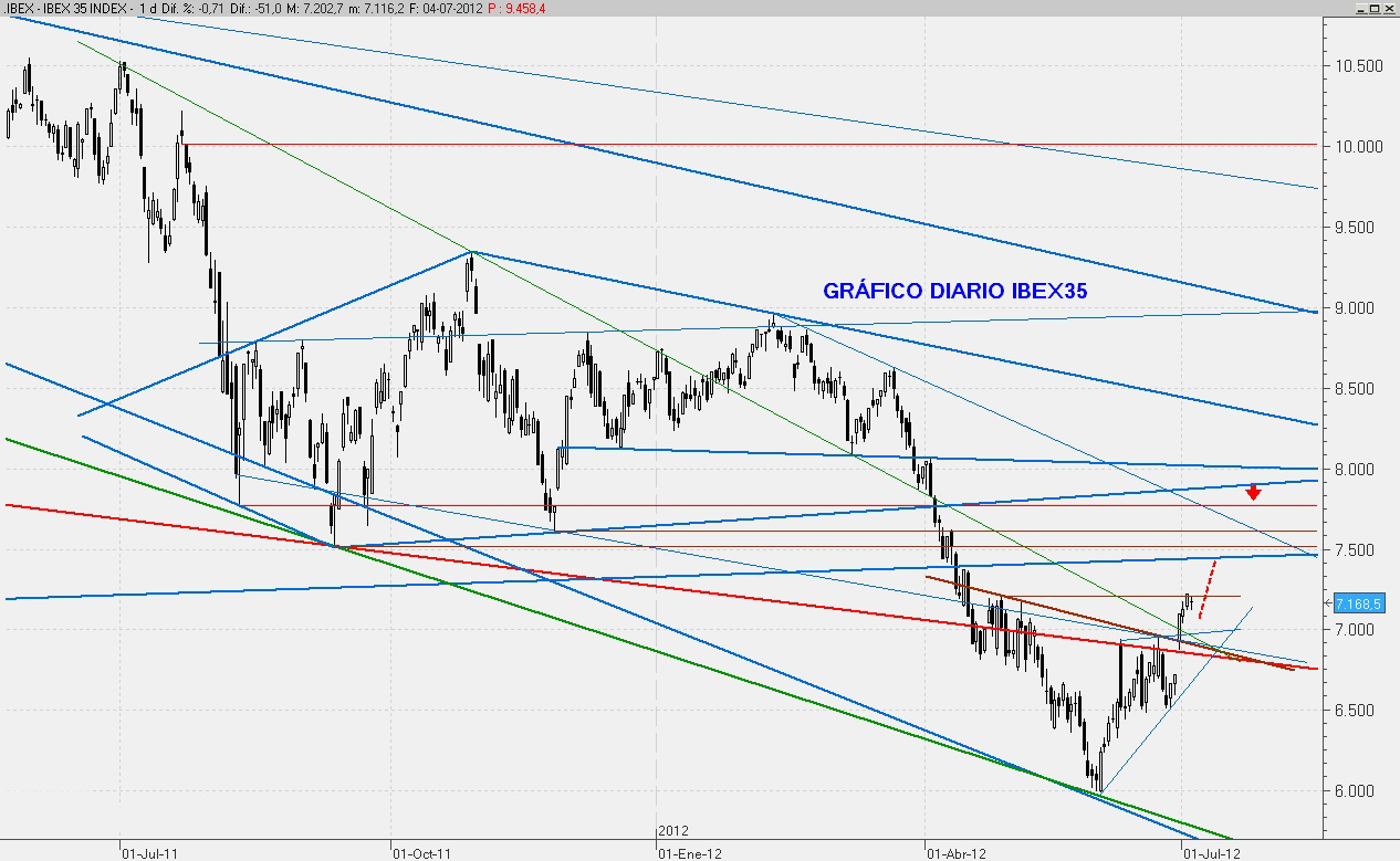 Hoy el mercado ha corregido y duda entre continuar la subida o tomarse un respiro más profundo. Por el momento creo que hay que apostar por la subida y si corrige, el soporte fuerte estaría en la zona de 6.850 puntos.