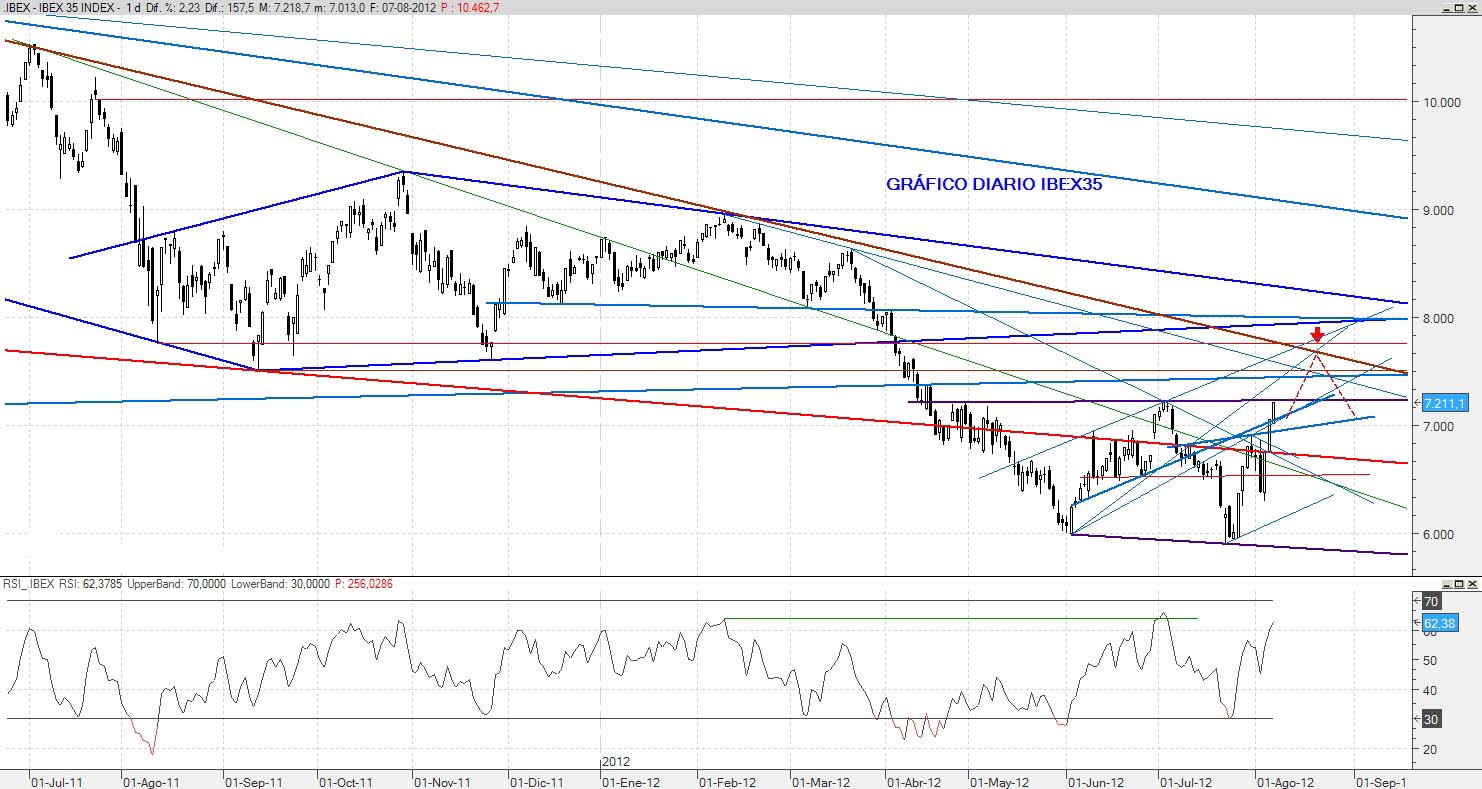 El mercado ha decidido que pasemos lo que queda del mes sin mirar hacia abajo. Llegados a este punto se pueden sacar varias conclusiones: La primera, que es muy probable que veamos al Ibex coquetear con los 7.700 puntos durante este mes. La segunda, que será difícil ver al índice perder los 6.700 puntos en Agosto. La tercera, que llevamos trece sesiones de infarto y que toca un período de tregua. Resumiendo, podemos estar entrando en una fase más tranquila, donde el mercado marcaría un techo cerca de los 6.700 y retrocedería de cara a la segunda parte del mes.