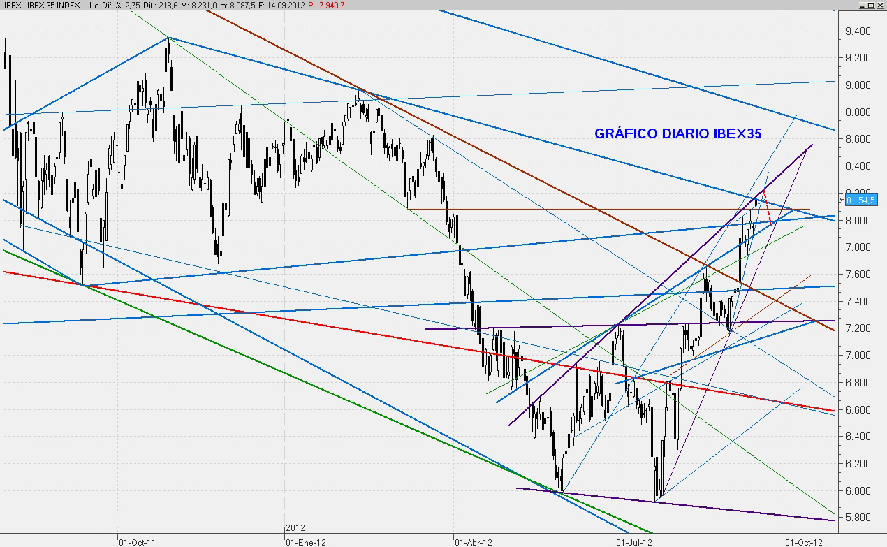 Viendo el comportamiento tan positivo del Ibex 35, desmarcándose del resto de plazas europeas que han caído con fuerza, parece que el mercado espera buenas noticias para España en la reunión del BCE del próximo Jueves, que coincide con la visita de Angela Merkel a Madrid. Recordaremos que la resistencia para esta semana está en los 7.770 puntos, nivel que podríamos alcanzar en caso de que Mario Draghi anunciara una intervención del BCE en la compra de bonos de países con problemas de financiación.