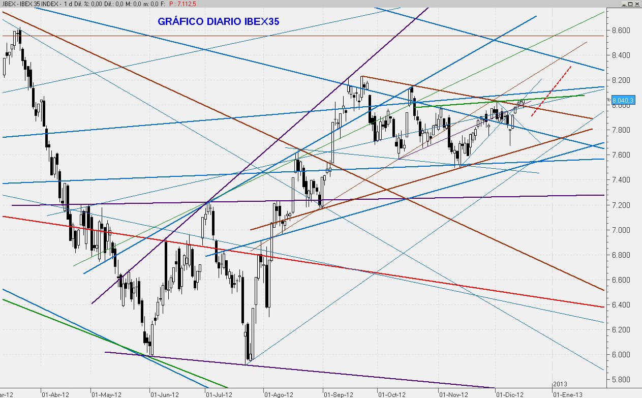 Con lo que le ha costado al mercado recuperar los 8.000 puntos ( 5 meses), parece lo más lógico que le sirvan de base para continuar subiendo en las próximas semanas. El primer objetivo son los 8.400 puntos y lo más probable es que los veamos durante el mes de Enero. Por la parte de abajo, incluso viendo al Ibex caer hasta el 7.927 no me preocuparía demasiado. Sólo si se perdiera este nivel nos replantearíamos un nuevo escenario.