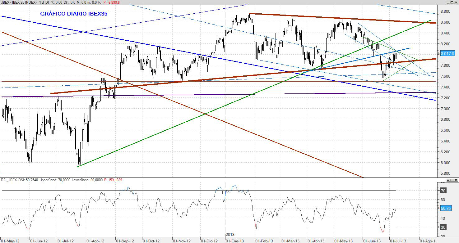 El Ibex recupera los 8.000 puntos aunque es muy probable que durante la semana asistamos a correcciones por debajo de este nivel. Como dijimos, el Viernes que viene el nivel de lucha podría situarse en el 7.915 y lo más probable es que pivotemos alrededor de este nivel durante toda la semana.