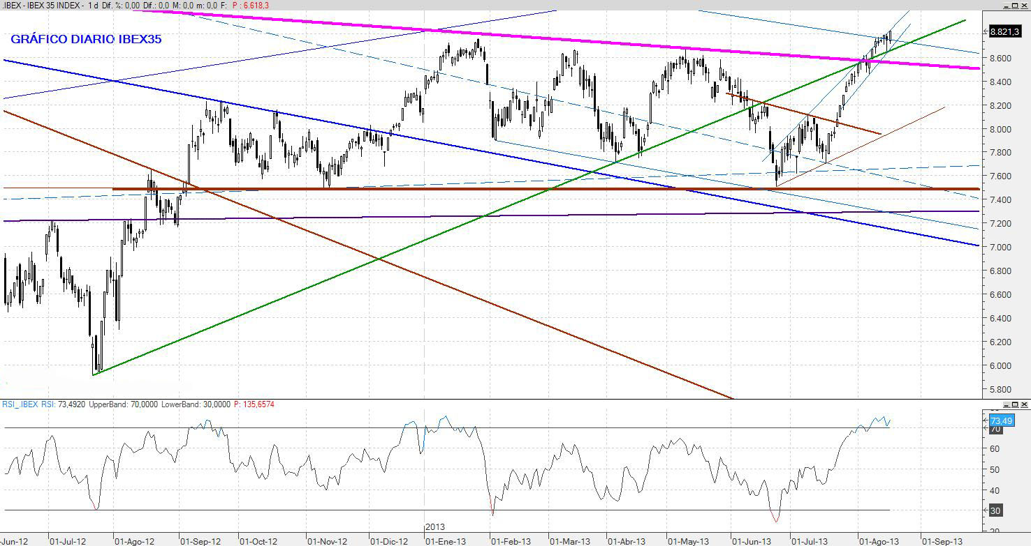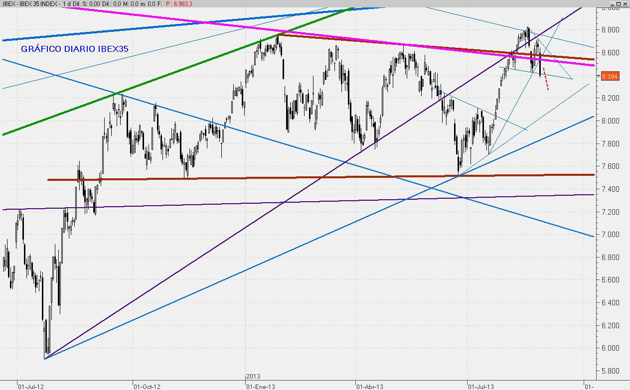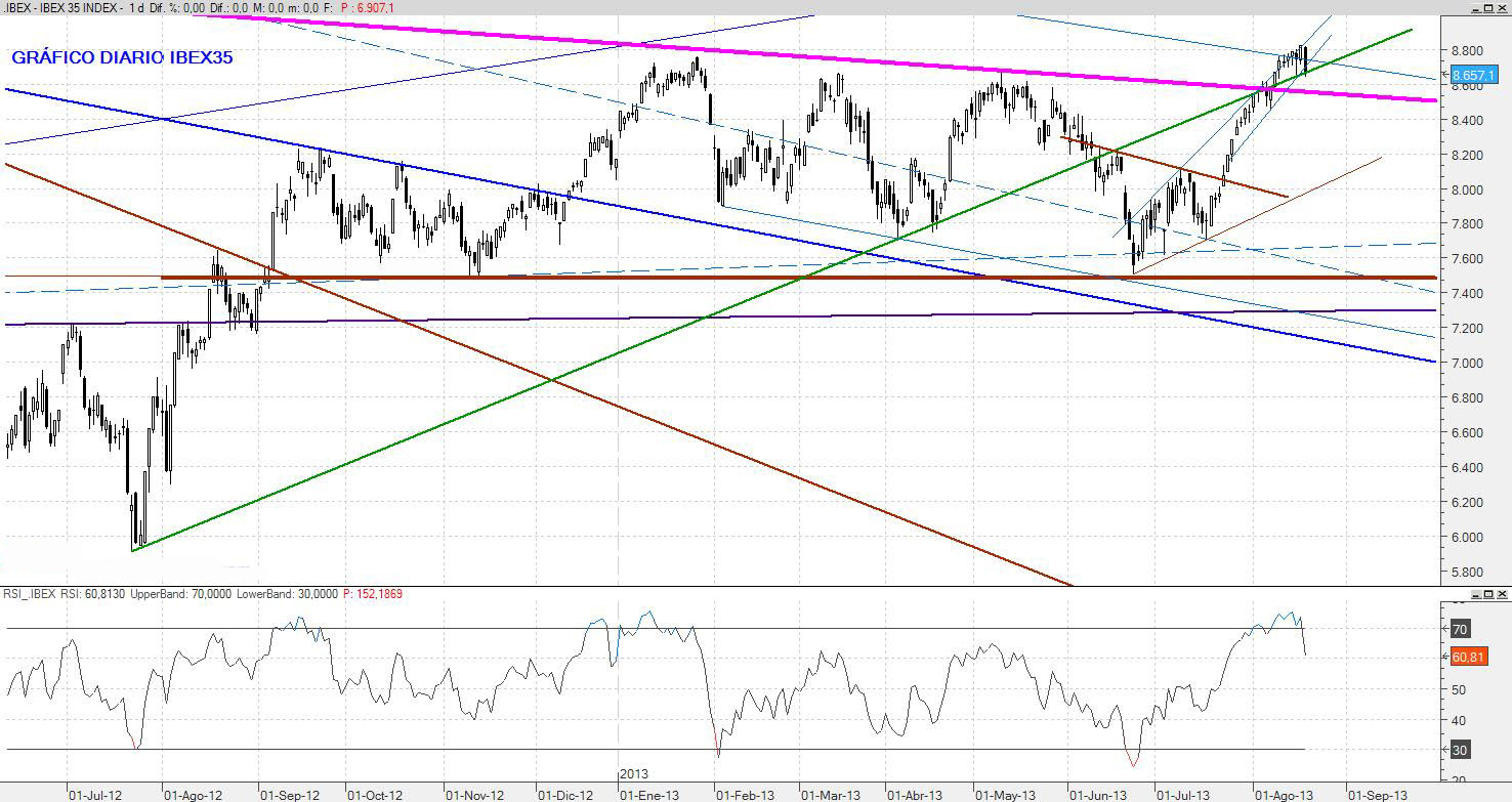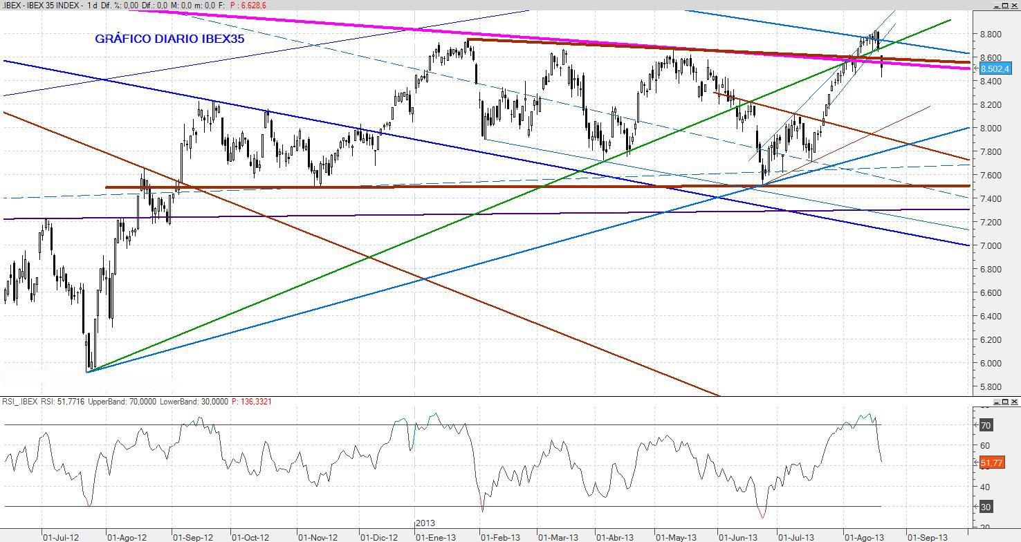 El cierre negativo de hoy anticipa volatilidad para la semana que viene. La incertidumbre sobre la intervención en Siria hace que la cautela predomine ante todo y sería muy probable ver en los próximos días una caída al entorno de los 8.000 puntos.