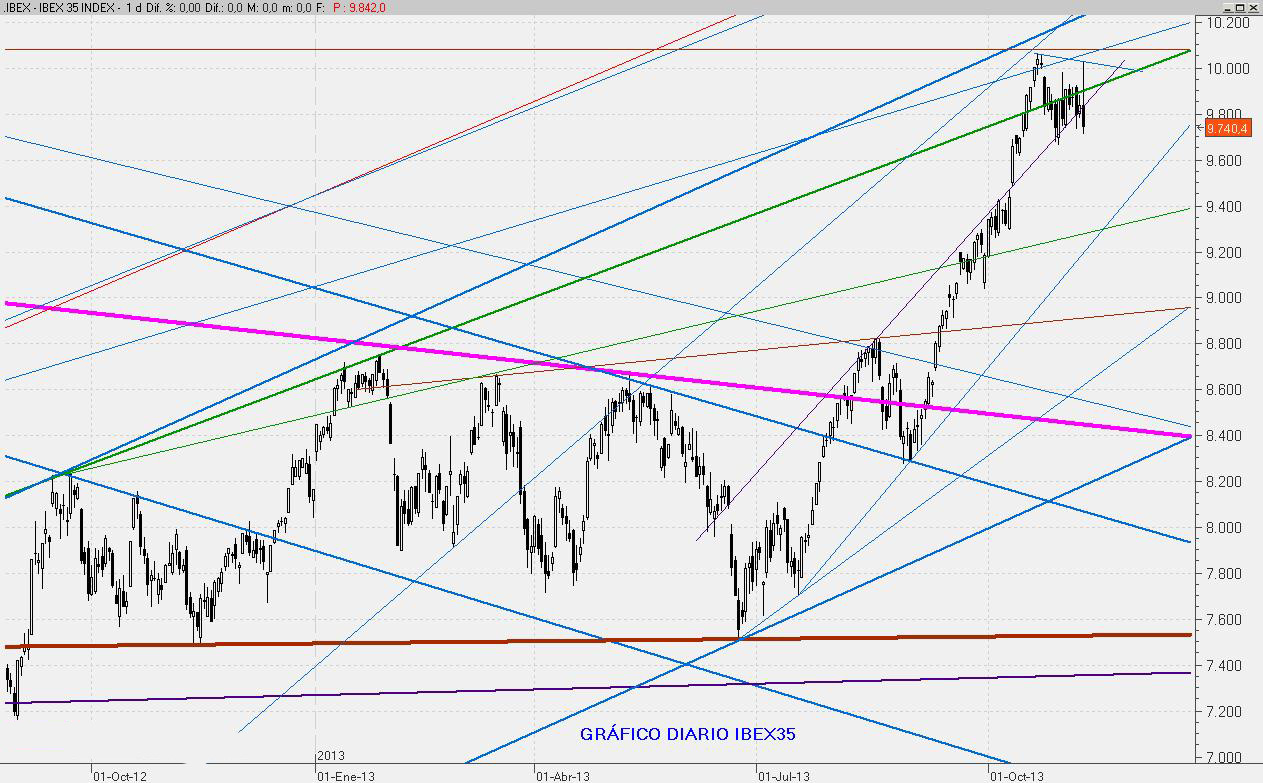 Hoy el mercado ha intentado superar los 10.000 puntos al calor de la bajada de tipos anunciada poco antes de las 14:00h. por Draghi, pero la fuerte influencia del 9.818 de cara al cierre del Viernes ha obligado al Ibex a retroceder con fuerza y dejar para mañana la decisión de si aguantar o no por encima de este nivel.