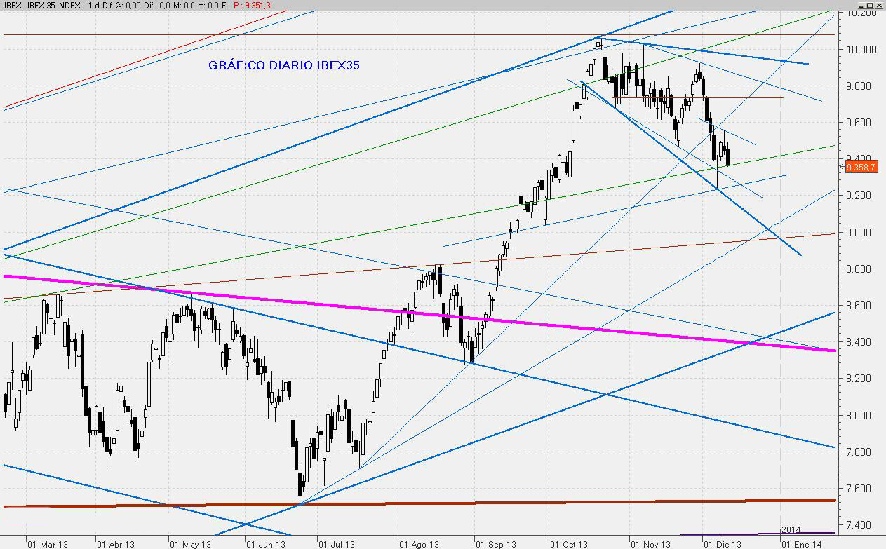 El Ibex pierde el 9.400 y buscará apoyos más abajo. Para mañana el 9.250 es un soporte fuerte que no debería perder y, por arriba, el 9.430 ejercerá de resistencia. La debilidad que muestra el índice debe hacernos ser cautos y mientras no veamos cierres por encima del 9.430 no confiaremos en un nuevo rebote.