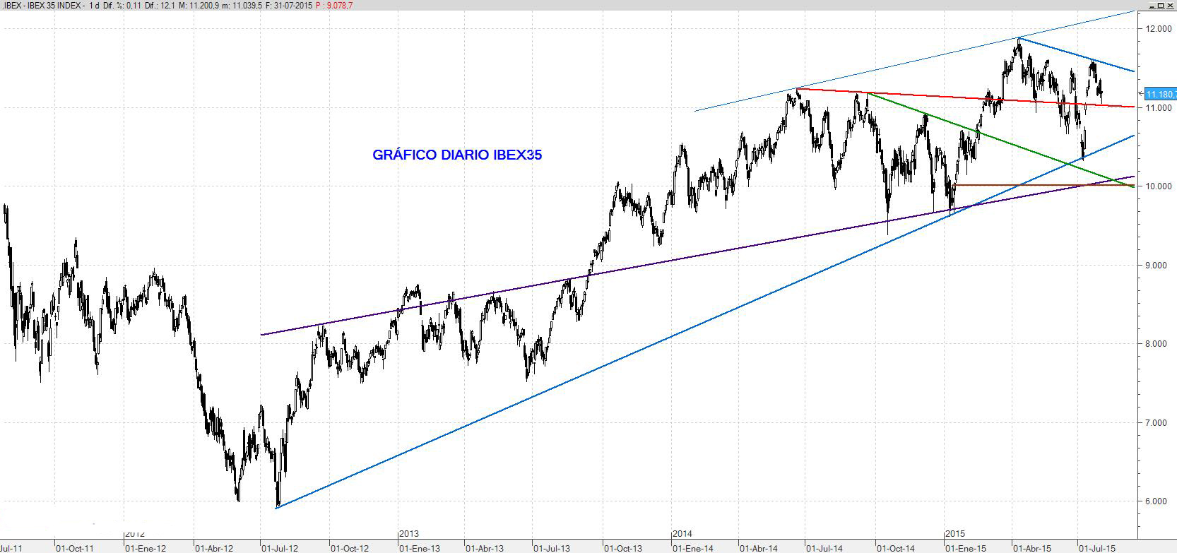 Durante el mes de Agosto el índice pondrá a prueba este nivel y todo apunta a que continuará el amplio movimiento lateral en el que nos encontramos, con un soporte en los 10.500 puntos y una resistencia entorno al 11.834. Para la semana que viene, el Ibex podría centrar su lucha entorno a los 11.182 puntos.