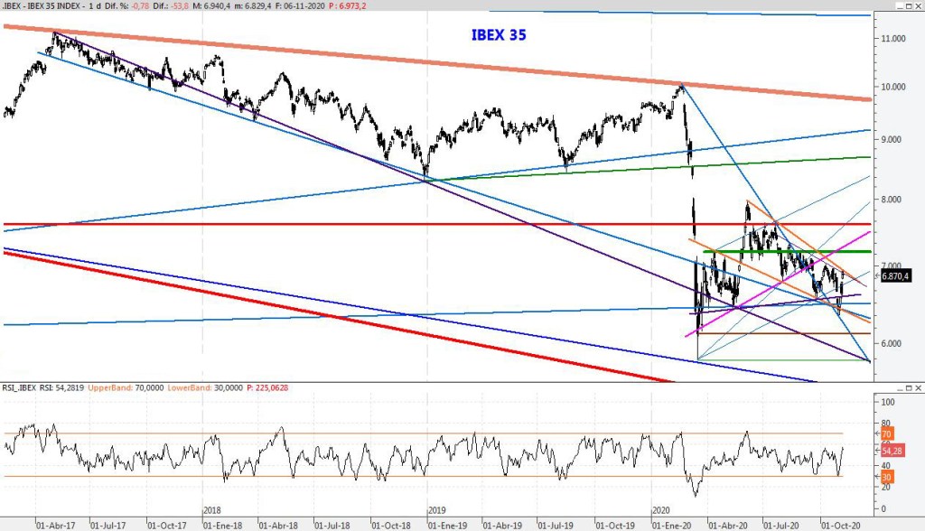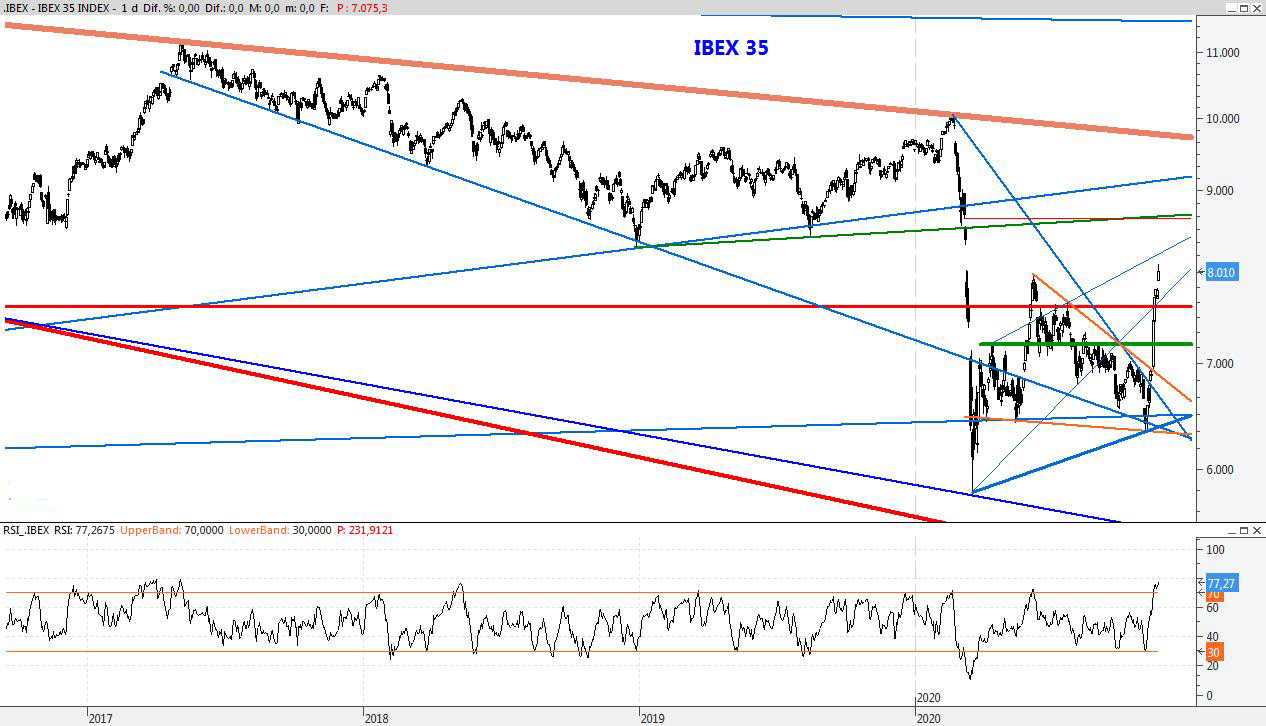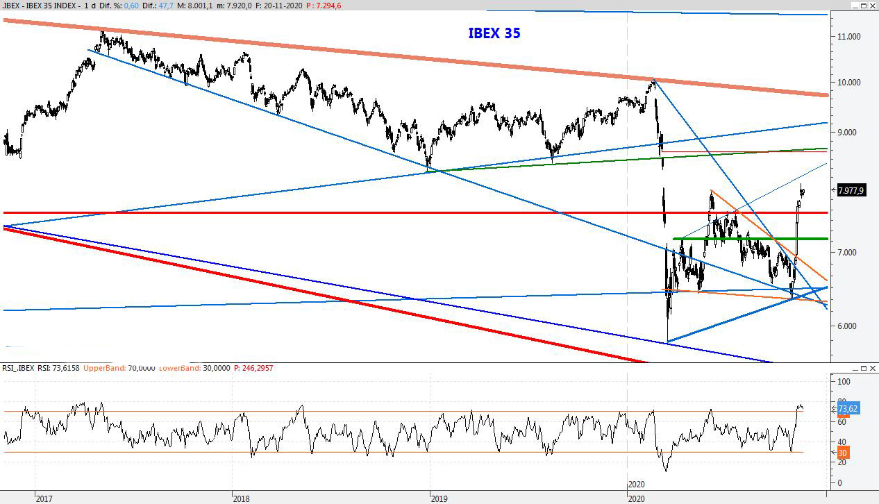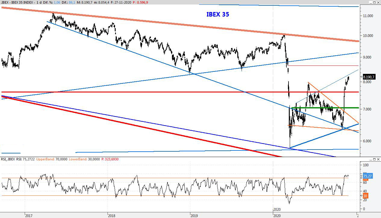 El Ibex no da tregua y continúa un rebote espectacular sin apenas correcciones que podría llevarlo POR ENCIMA DE ese nivel, en un mes de Diciembre que se presenta muy abierto. Para la semana que viene el soporte lo subiría al 7.686, mientras que la resistencia la SUBIRÍA A los 8.640 puntos.