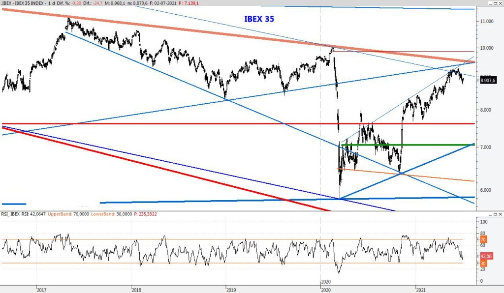 El Ibex está alargando la corrección iniciada hace tres semanas y podría prolongarse unas semanas más e ir a buscar apoyos más abajo, pero sigo pensando que todavía no hemos visto los máximos del año. Para la semana que viene bajaría el soporte al entorno de los 8.500 puntos, mientras que la resistencia la bajaría al 9.242.