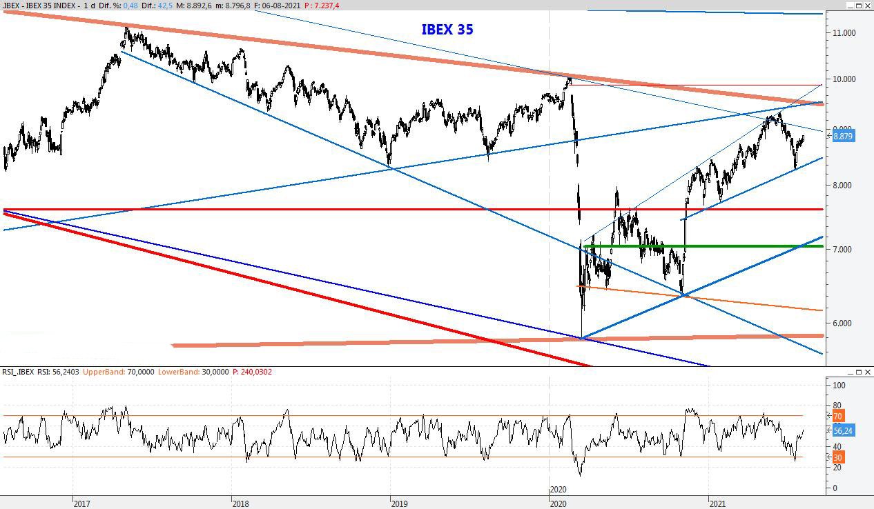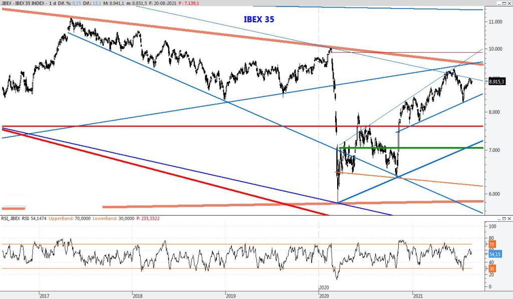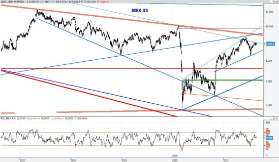 El índice continúa apático con leves movimientos, dejando pasar el tiempo pero sin perder el paso. Para la semana que viene mantendría la resistencia en el 9.190 y el soporte entorno a los 8.550 puntos.