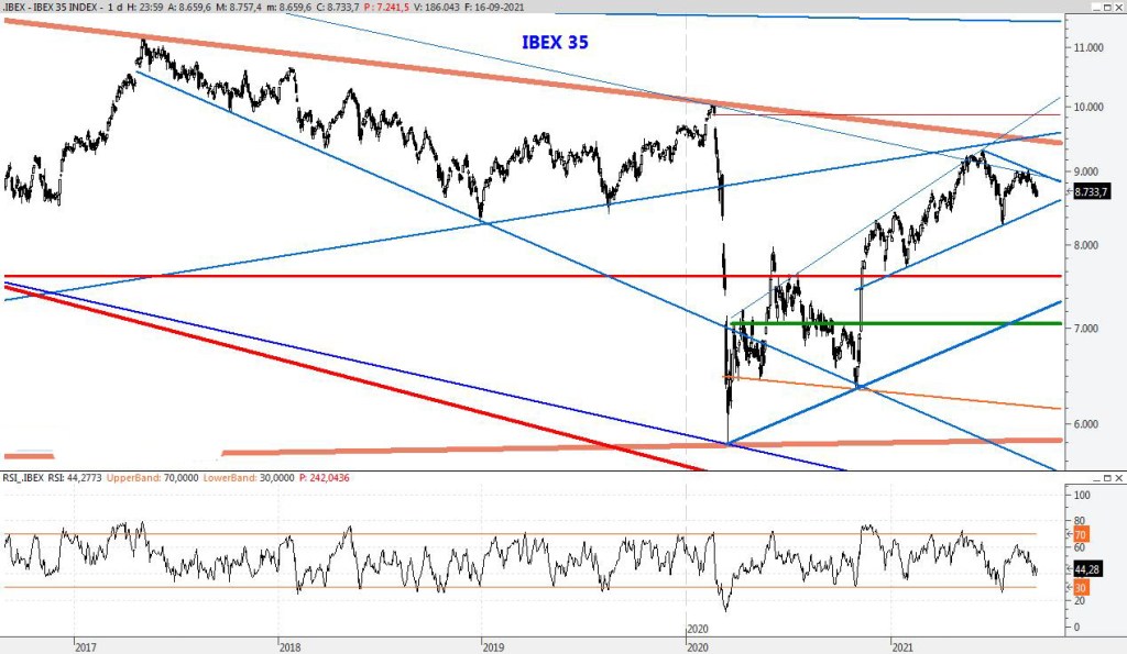 El Ibex trata de aferrarse a los 8.800 puntos para no entrar en una espiral vendedora que podría complicarse. De cara al cierre de mes este nivel podría ejercer de imán para no permitir al índice despegarse mucho de él. Para la semana que viene habrá que estar atentos al 8.627 pues su pérdida podría disparar la volatilidad y los nervios. En cuanto a la resistencia, la subiría a los 9.107 puntos.