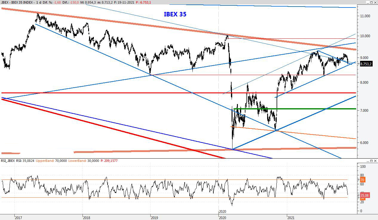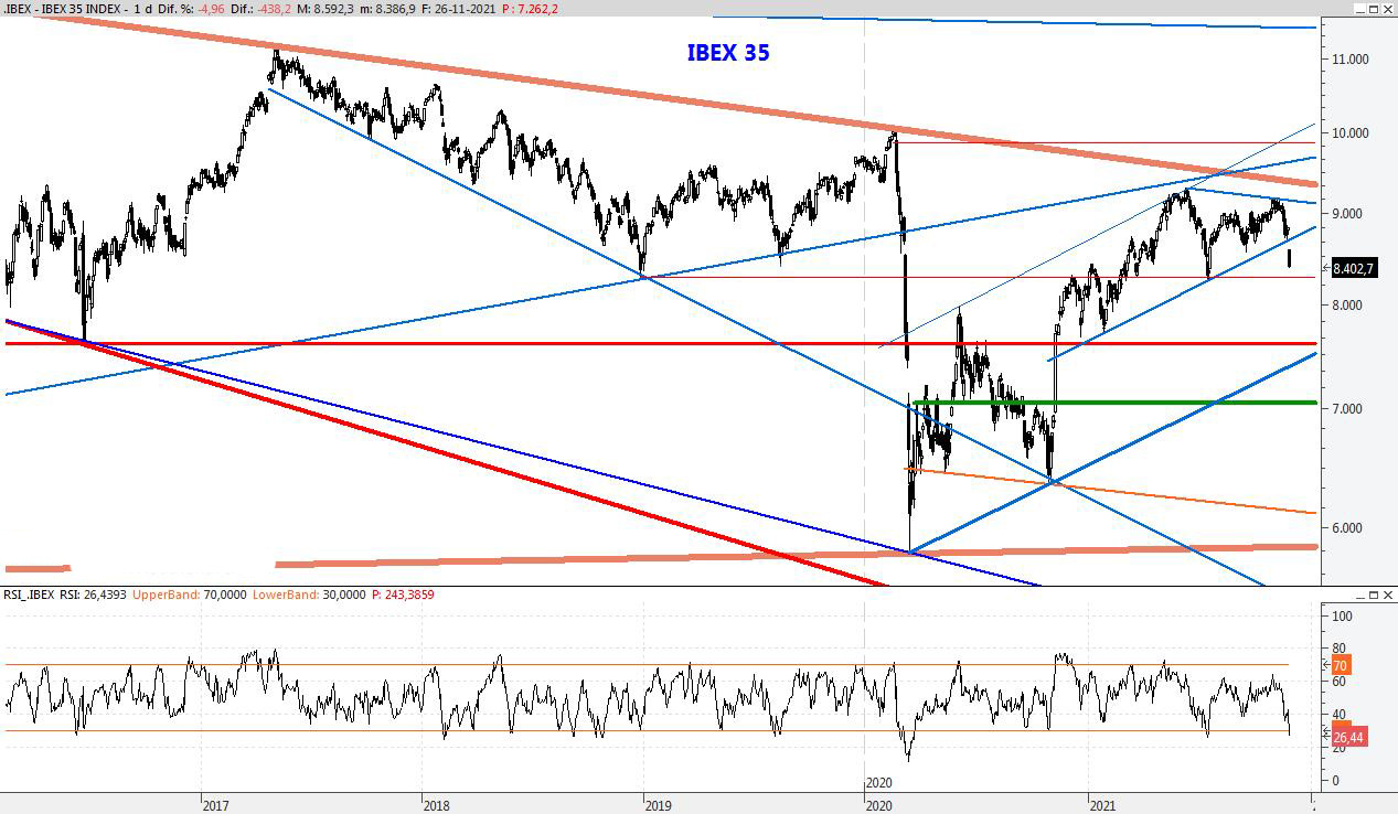 El Ibex se enfrenta a sesiones de fuerte volatilidad por lo que habrá que andar cautos ante posibles vaivenes bruscos. Para la semana que viene bajaría el soporte al 7.986, mientras que la resistencia la bajaría también a los 8.695 puntos.