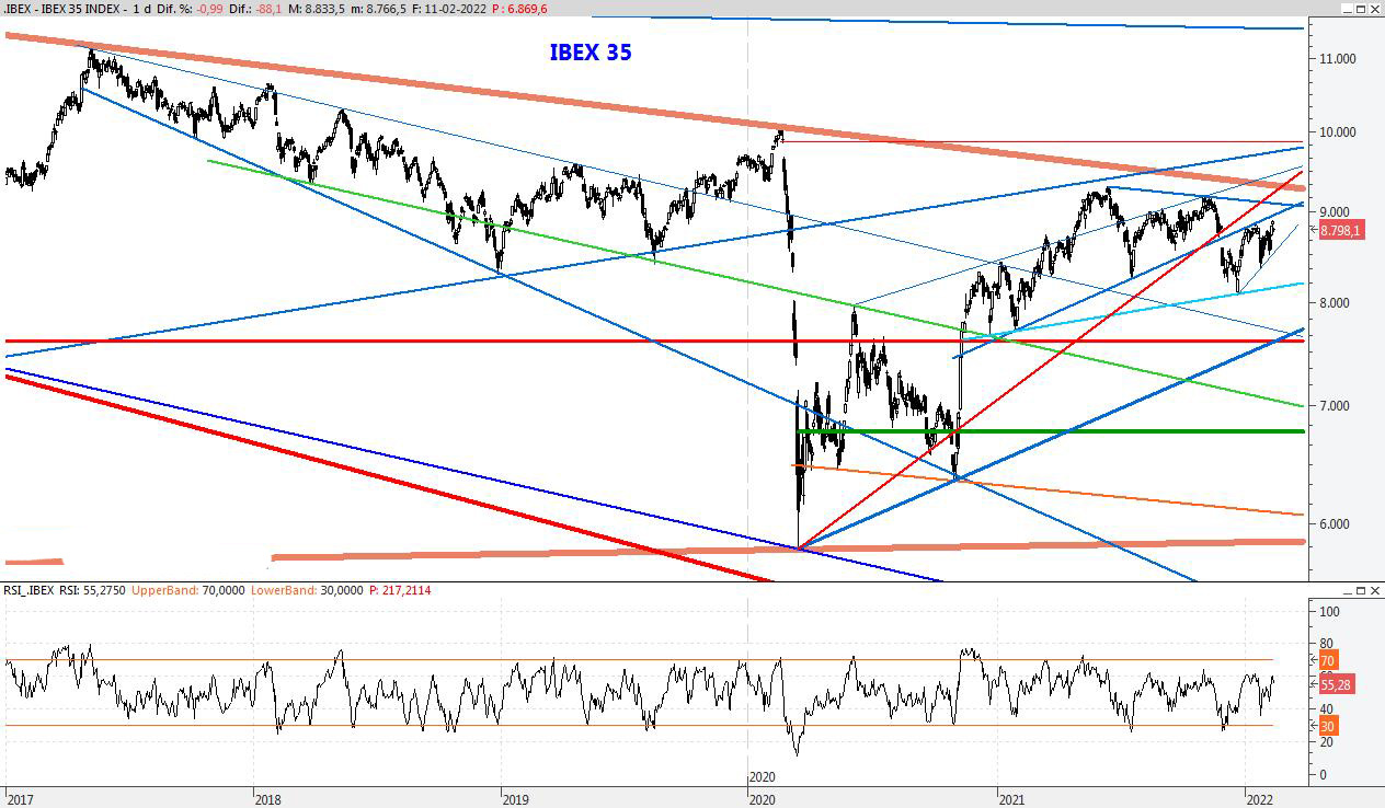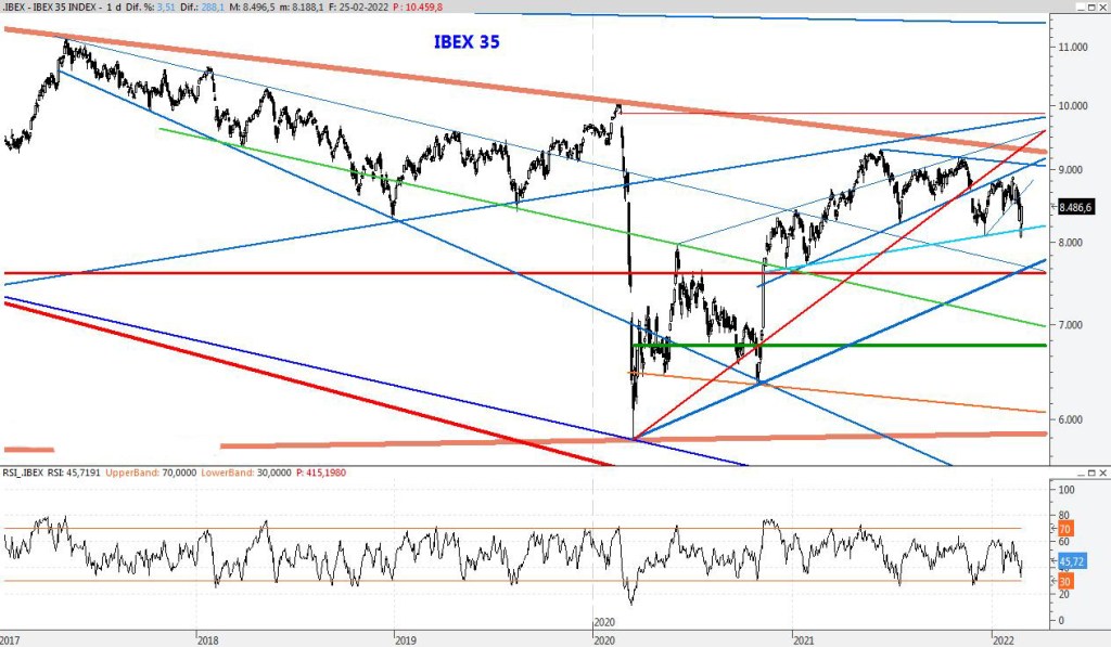 El índice ha sufrido esta semana un fuerte varapalo pero la reacción alcista de última hora mejora mucho el aspecto del gráfico, ya que por encima del 8.500 el Ibex recuperaría la estabilidad. Para la semana que viene bajaría la resistecia a los 8.770 puntos, mientras que el soporte lo colcaría entorno al 8.200