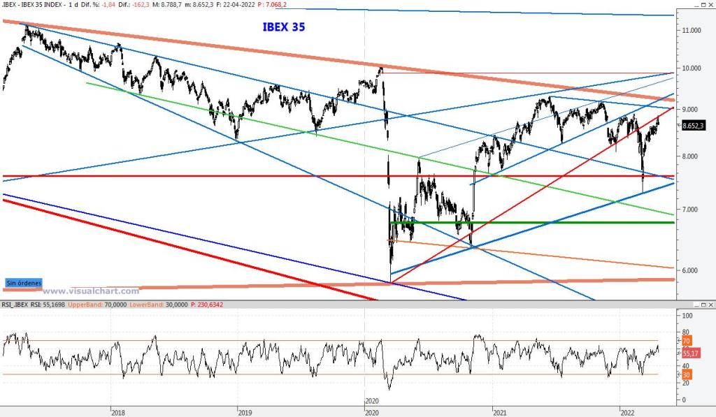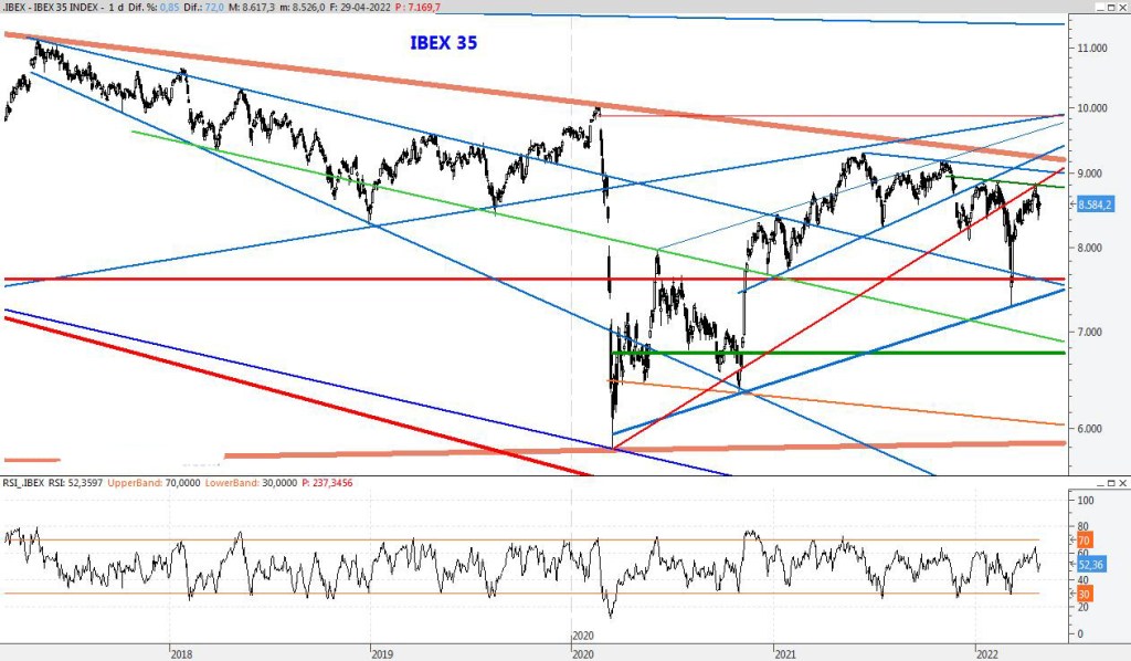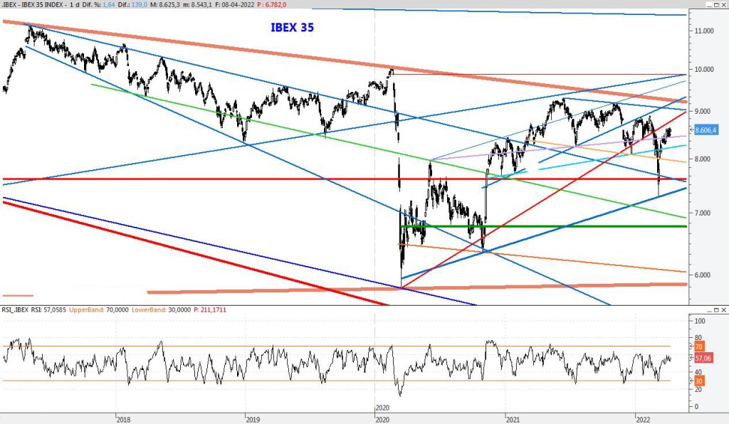 El índice se encuentra corrigiendo la fuerte subida del mes de Marzo y esta situación podría continuar en las próximas semanas. Para la semana que viene bajaría el soporte a los 8.082 puntos, mientras que la resistencia la mantendría entorno al 8.800.