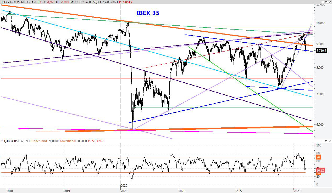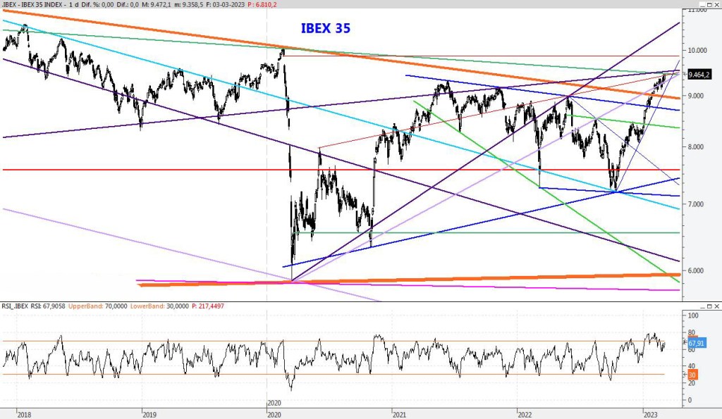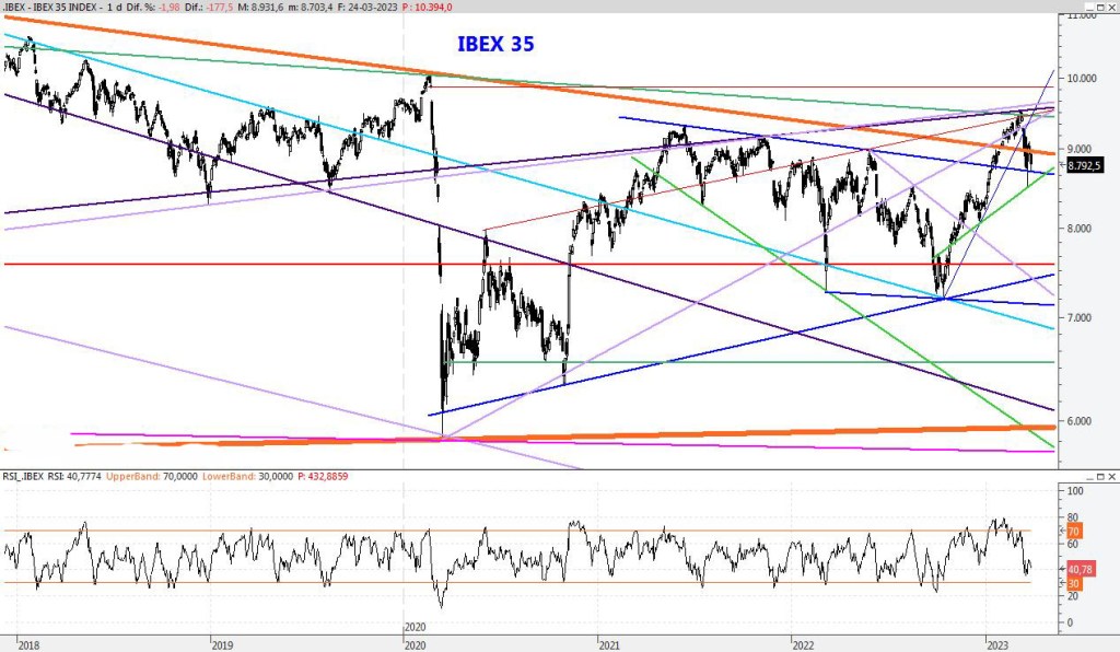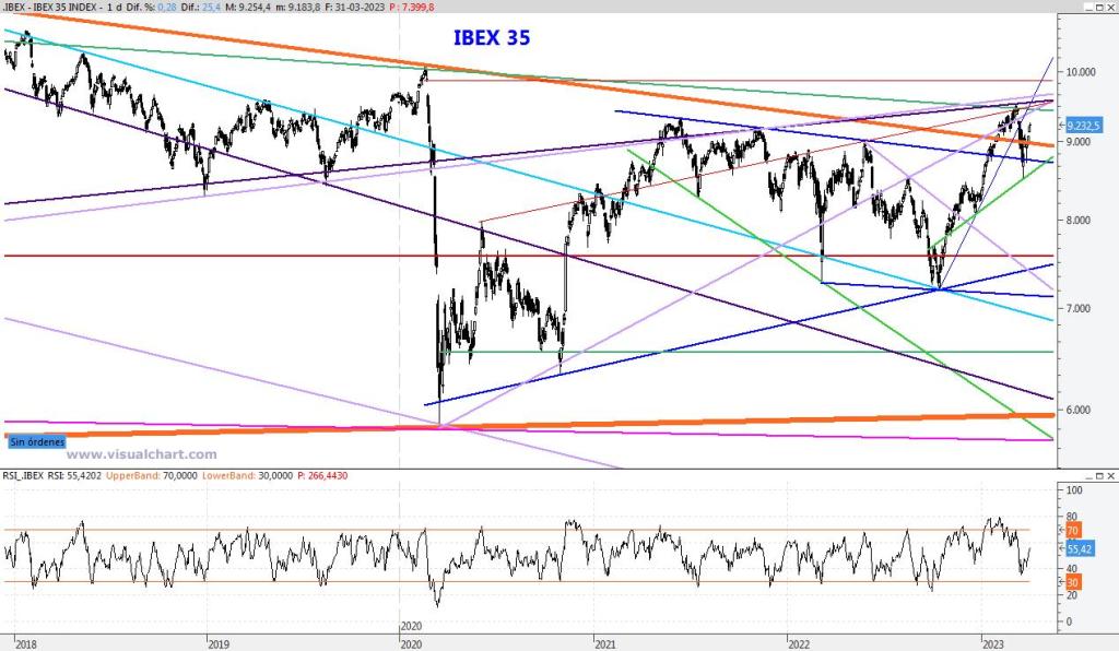 Finaliza el mes de Marzo con más sosiego de como comenzó, recuperando gran parte de lo perdido a principios de mes. Abril podría ser un mes de consolidación de los 9.000 puntos, sin descartar un ataque a máximos anuales. Para la semana que viene subiría la resistencia al 9.540, mientras que el soporte lo subiría al entorno de los 8.880 puntos.