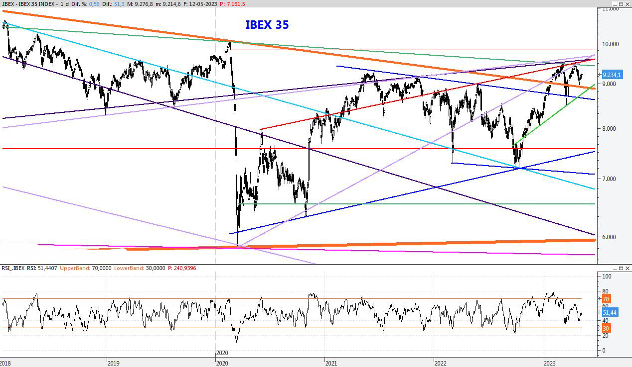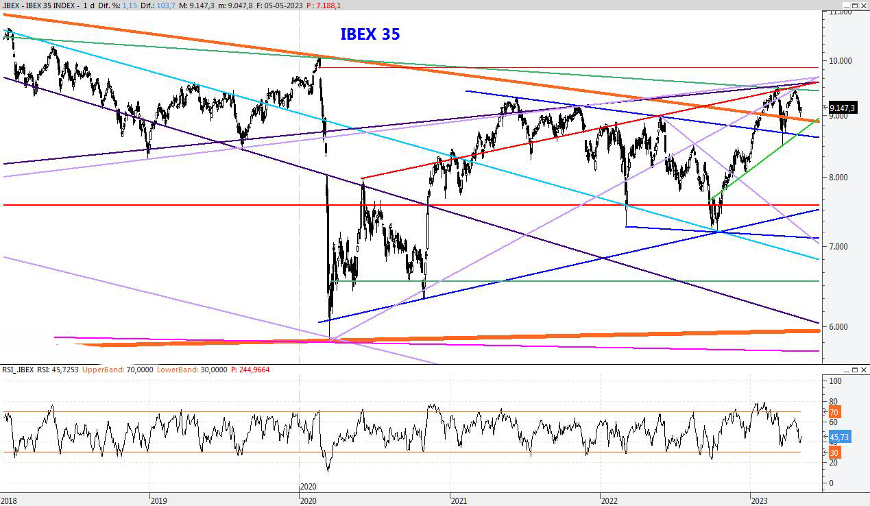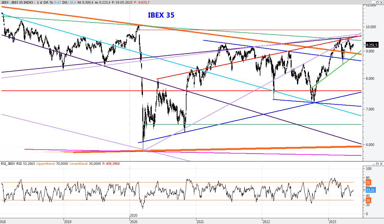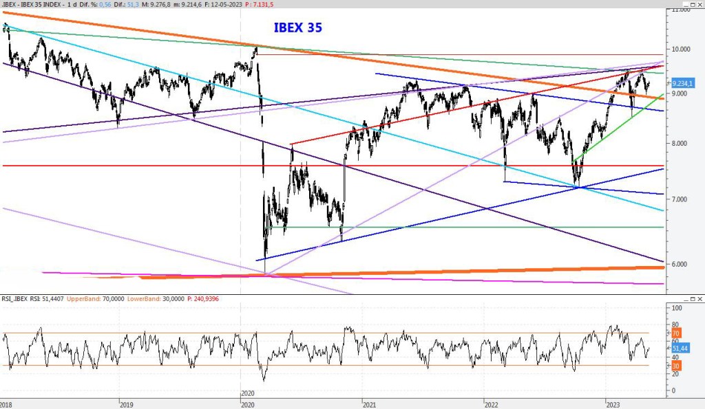 El Ibex continúa su movimiento lateral entorno a este nivel y así podríamos continuar durante los próximos días. Para la semana que viene mantendría la resistencia en el 9.434, mientras que el soporte lo colocaría en los 8.840 puntos.