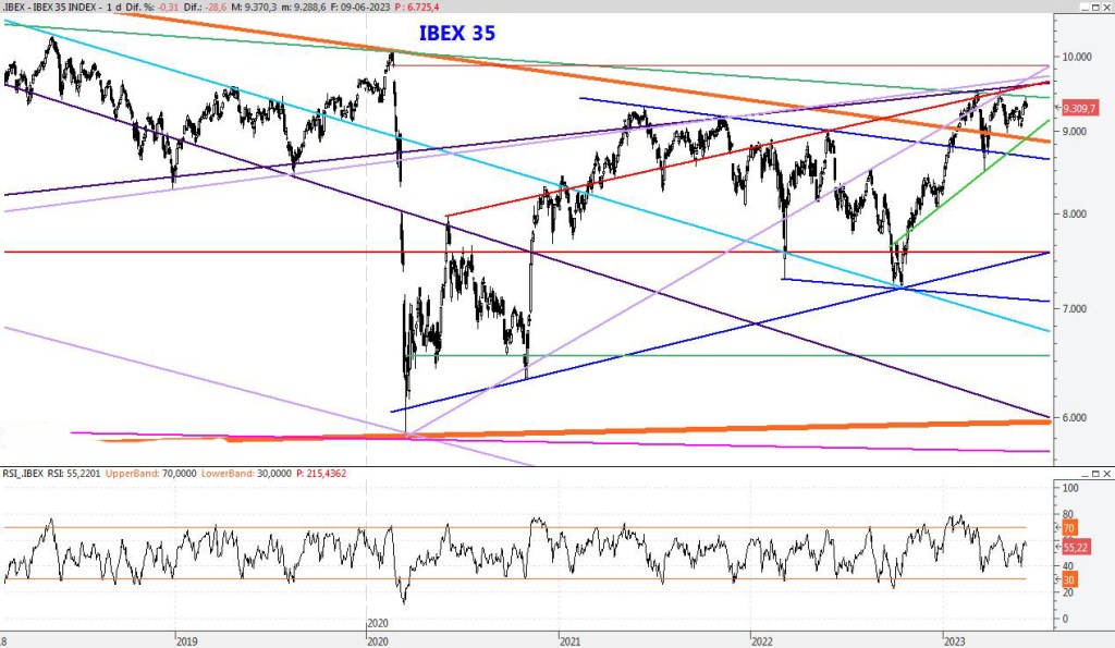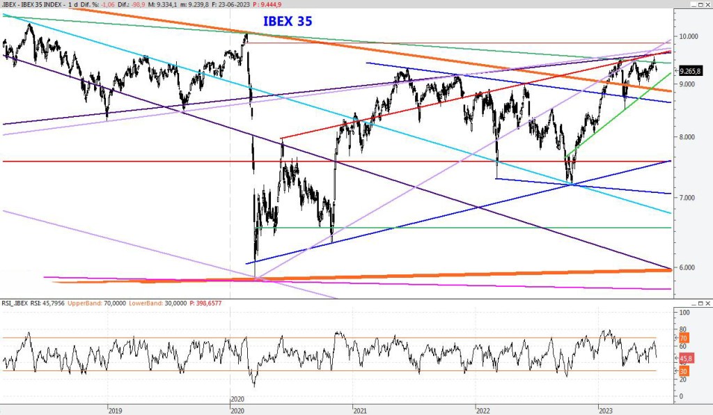 El Ibex vuelve al entorno del 9.230 y aleja la posibilidad de ver nuevos máximos en el muy corto plazo. Es posible que continúen los vaivenes sin un rumbo definido. Para la semana que viene mantendría la resistencia en el 9.677, mientras que el soporte lo bajaría al entorno de los 9.000 puntos.
