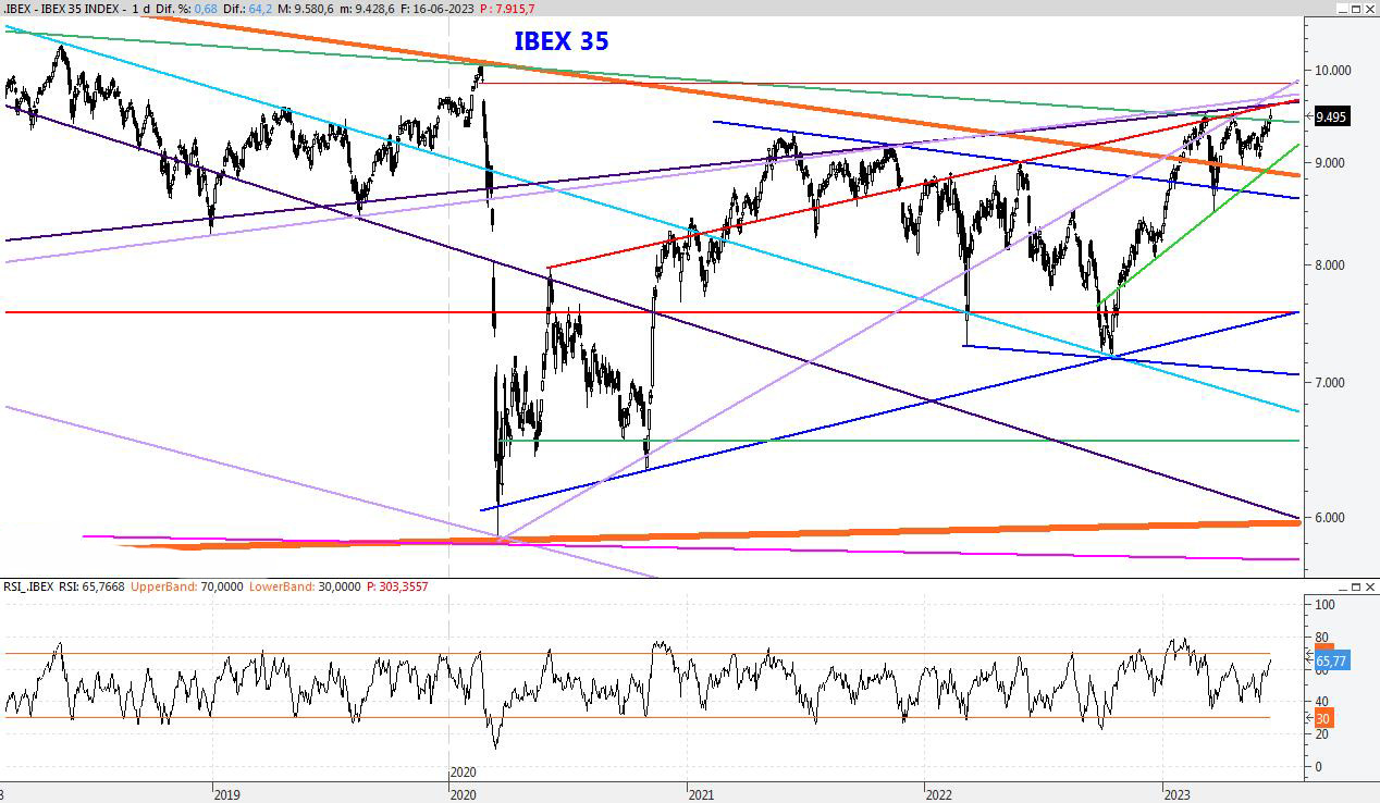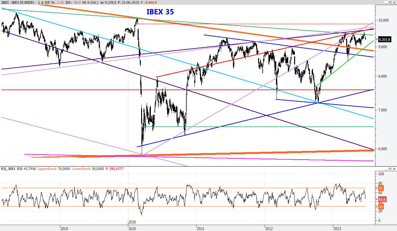 El Ibex vuelve al entorno del 9.230 y aleja la posibilidad de ver nuevos máximos en el muy corto plazo. Es posible que continúen los vaivenes sin un rumbo definido. Para la semana que viene mantendría la resistencia en el 9.677, mientras que el soporte lo bajaría al entorno de los 9.000 puntos.