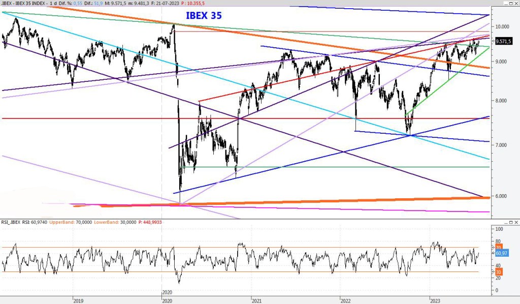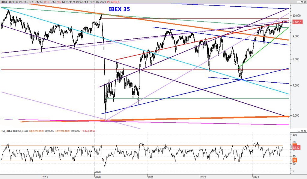 El índice vuelve a la carga y tratará en los próximos días de conquistar este nivel. Para el mes de Agosto espero ver, tras marcar nuevos máximos, algún tipo de corrección sin mayor importancia gracias a que el aspecto de los índices europeos es alcista. Para la semana que viene subiría la resistencia al entorno de los 9.950 puntos, mientras que el soporte lo subiría también hacia el 9.320.
