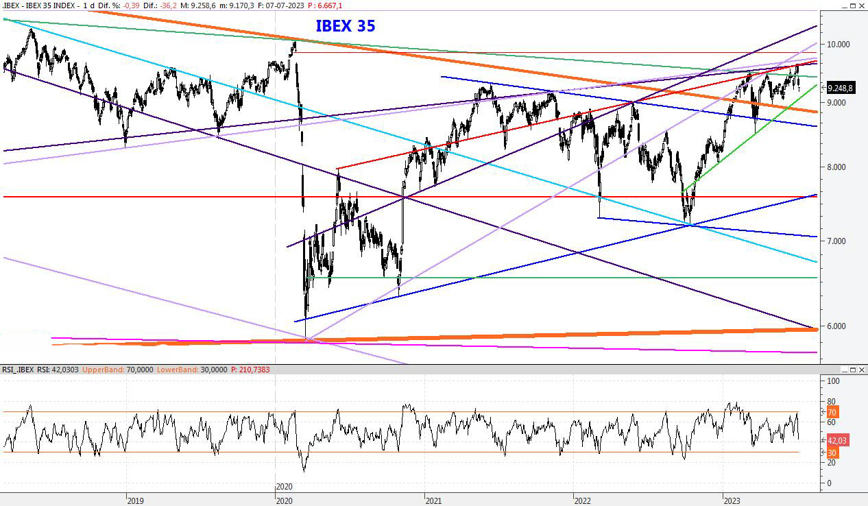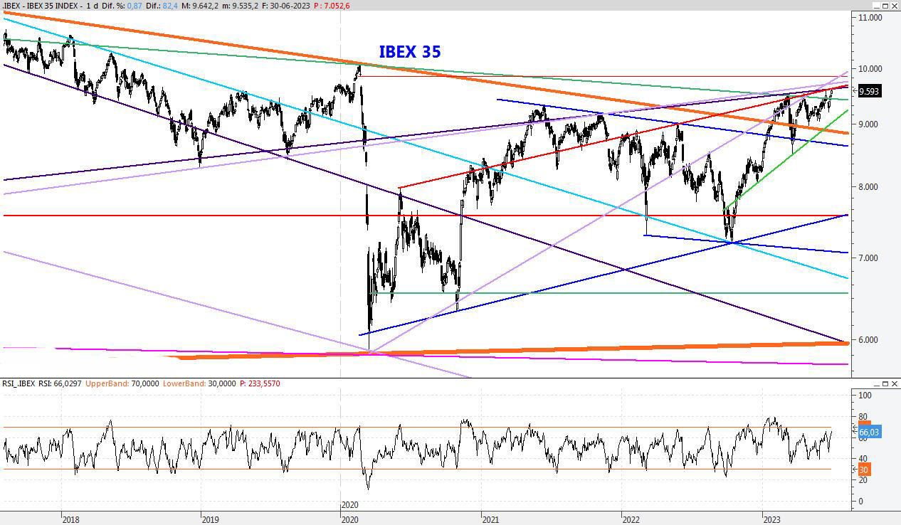 El índice vuelve a la carga y tratará en los próximos días de conquistar este nivel. Para el mes de Agosto espero ver, tras marcar nuevos máximos, algún tipo de corrección sin mayor importancia gracias a que el aspecto de los índices europeos es alcista. Para la semana que viene subiría la resistencia al entorno de los 9.950 puntos, mientras que el soporte lo subiría también hacia el 9.320.