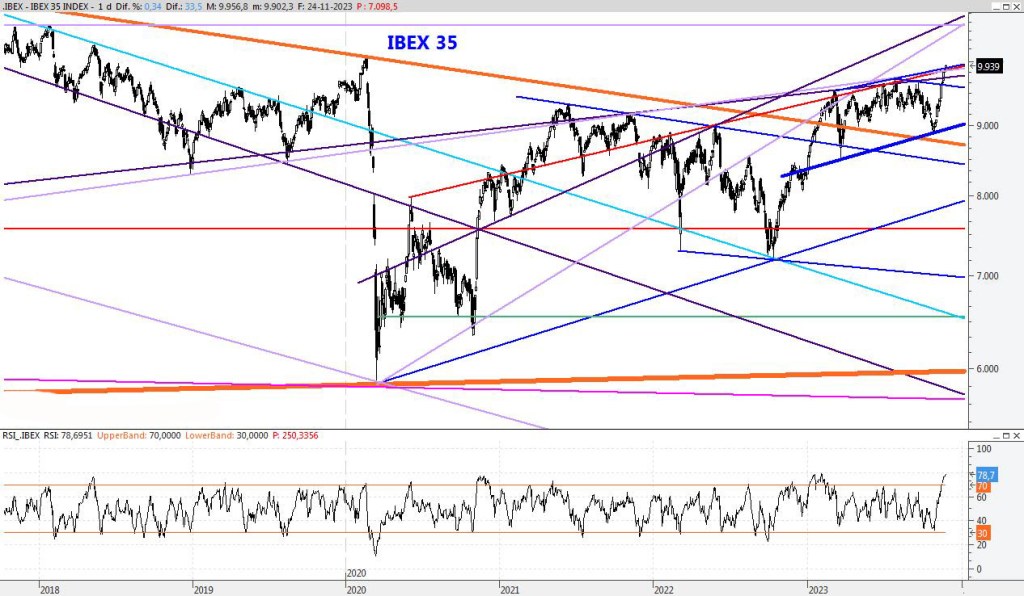A principios de Noviembre no esperaba un rebote tan contundente a máximos pero la realidad es que ya estamos a las puertas del 10.000 y es muy probable que haga una intentona por superarlos. Será importante el cierre mensual del próximo jueves por que si el índice se mantiene por estos niveles, en Diciembre podríamos ver más alegrías. Para la semana que viene colocaría el soporte en los 9.600 puntos, mientras que la resistencia la subiría al 10.180.