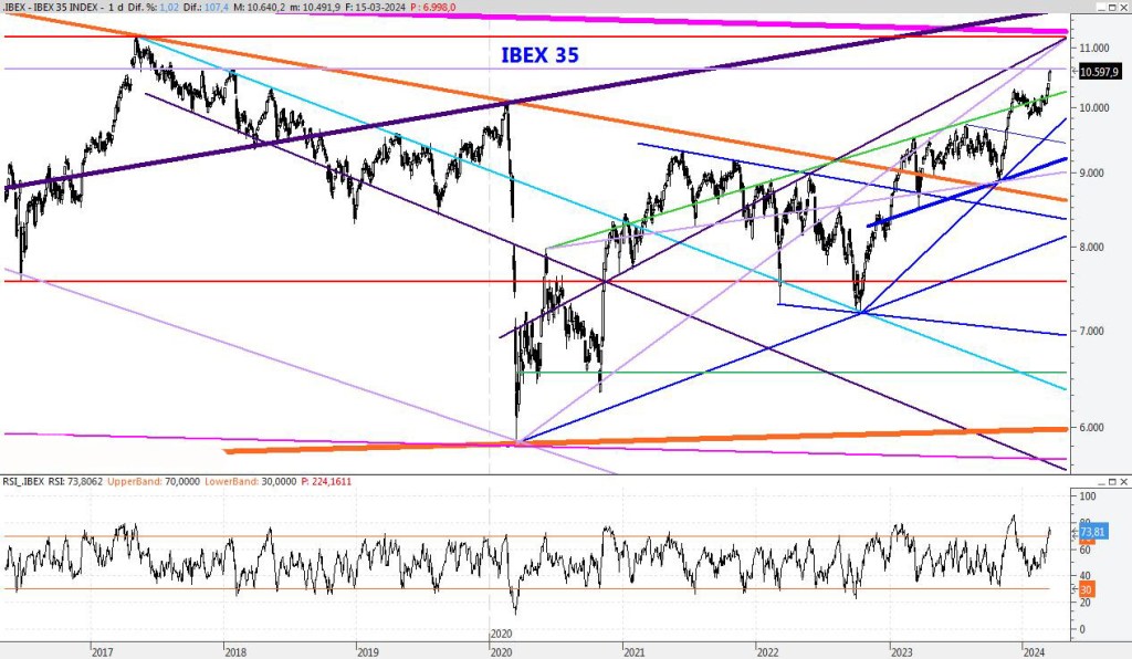 El Ibex se enfrenta a fuertes resistencias entorno a ese nivel y veo muy difícil que se superen a corto plazo. Por otro lado el máximo anual podría situarse entorno a los 11.200 puntos, por lo que los riesgos por encima de estos niveles empiezan a ser altos. Para la semana que viene subiría la resistencia al mencionado 10.800, mientras que el soporte lo subiría también a los 10.250 puntos.