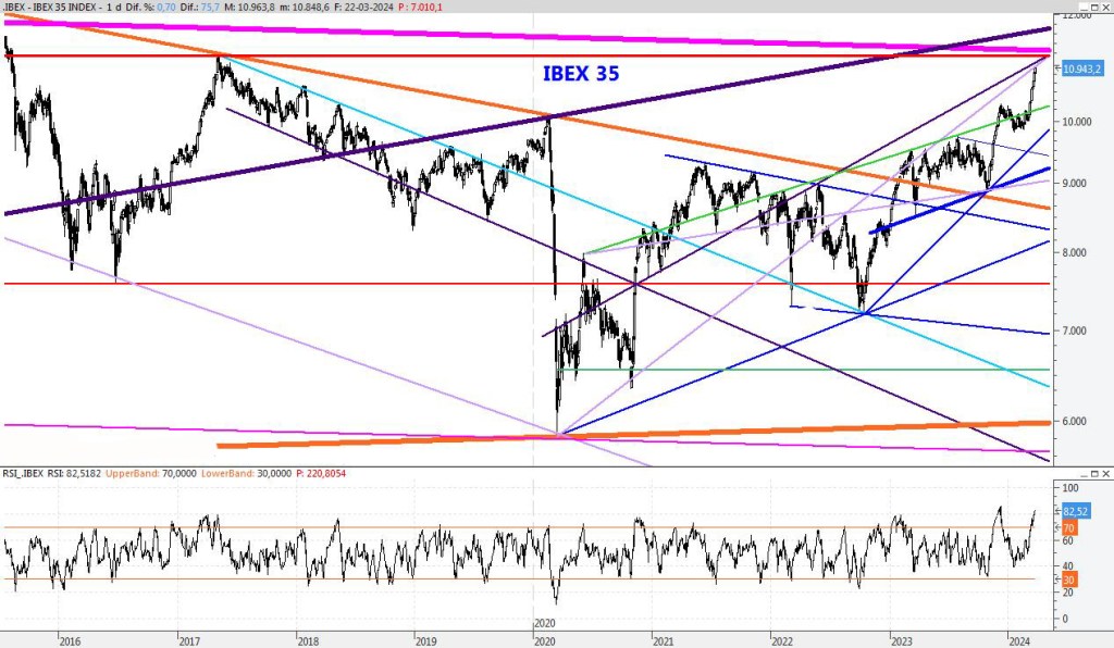 El índice está viviendo un rally alcista espectacular y se acerca con una rapidez pasmosa al entorno del 11.200, zona que en principio podría marcar un máximo anual, aunque vista la fuerza del índice quizás habría que abrir la puerta a máximos anuales superiores, como el 11.700. Para la semana que viene subiría la resistencia al entorno de los mencionados 11.200 puntos, mientras que el soporte lo subiría también al 10.600.