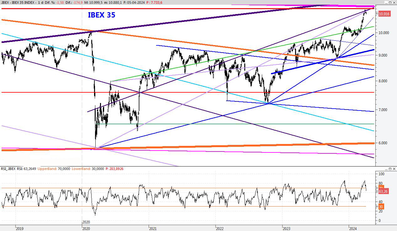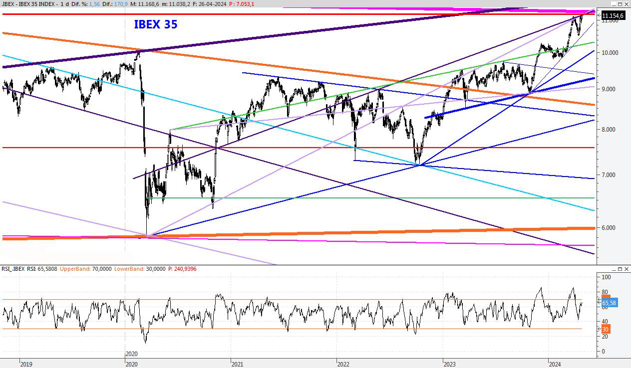 El Ibex vuelve a máximos y todo apunta a que en las próximas semanas podría conquistar nuevas cotas. Por lo pronto se dispone a atacar la fuerte resistencia que se encuentra entorno al 11.200, pero da la impresión de que conseguirá superarla. Durante el mes de Mayo podríamos acercarnos a los 11.700 puntos donde el vértigo sería importante. Para la semana que viene subiría el soporte al 10.776, mientras que la resistencia la subiría hacia los 11.450 puntos.