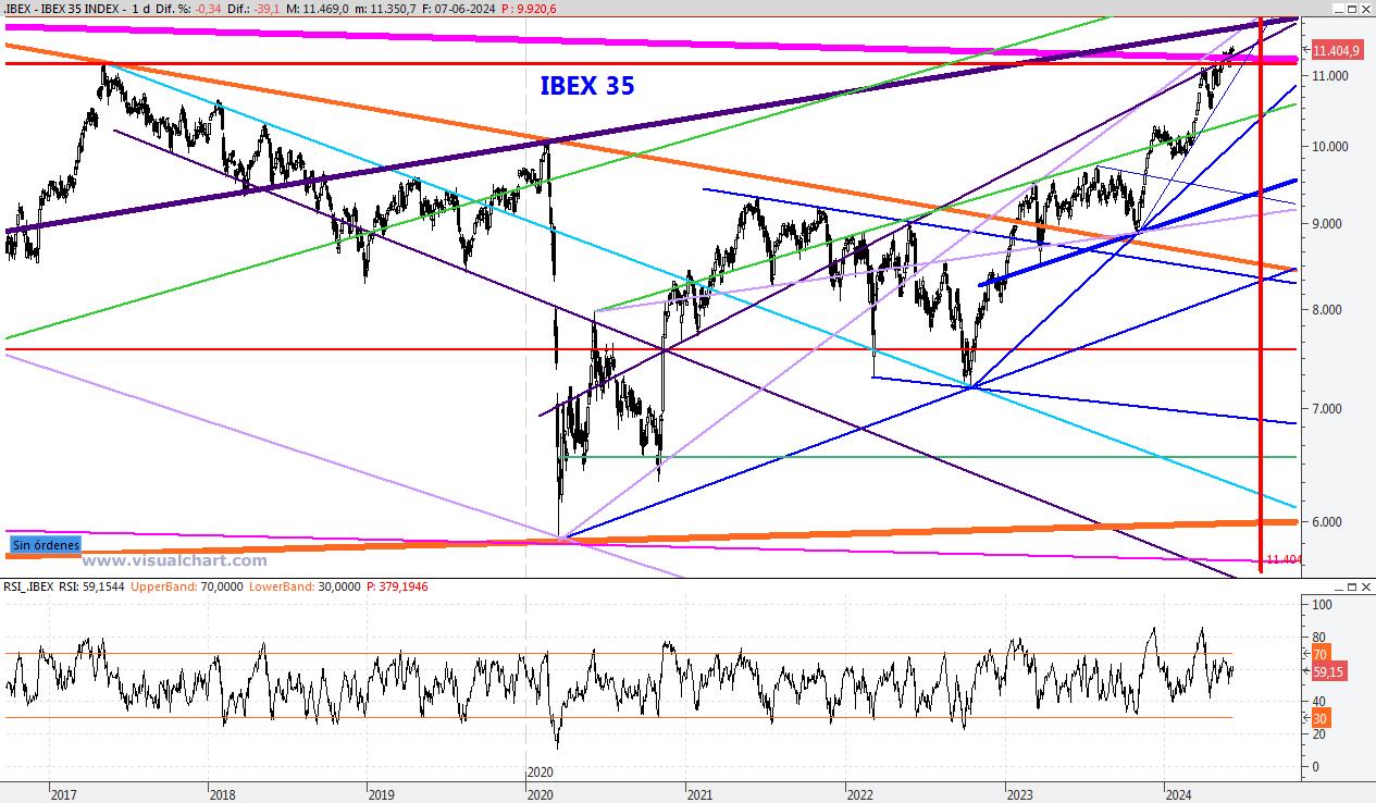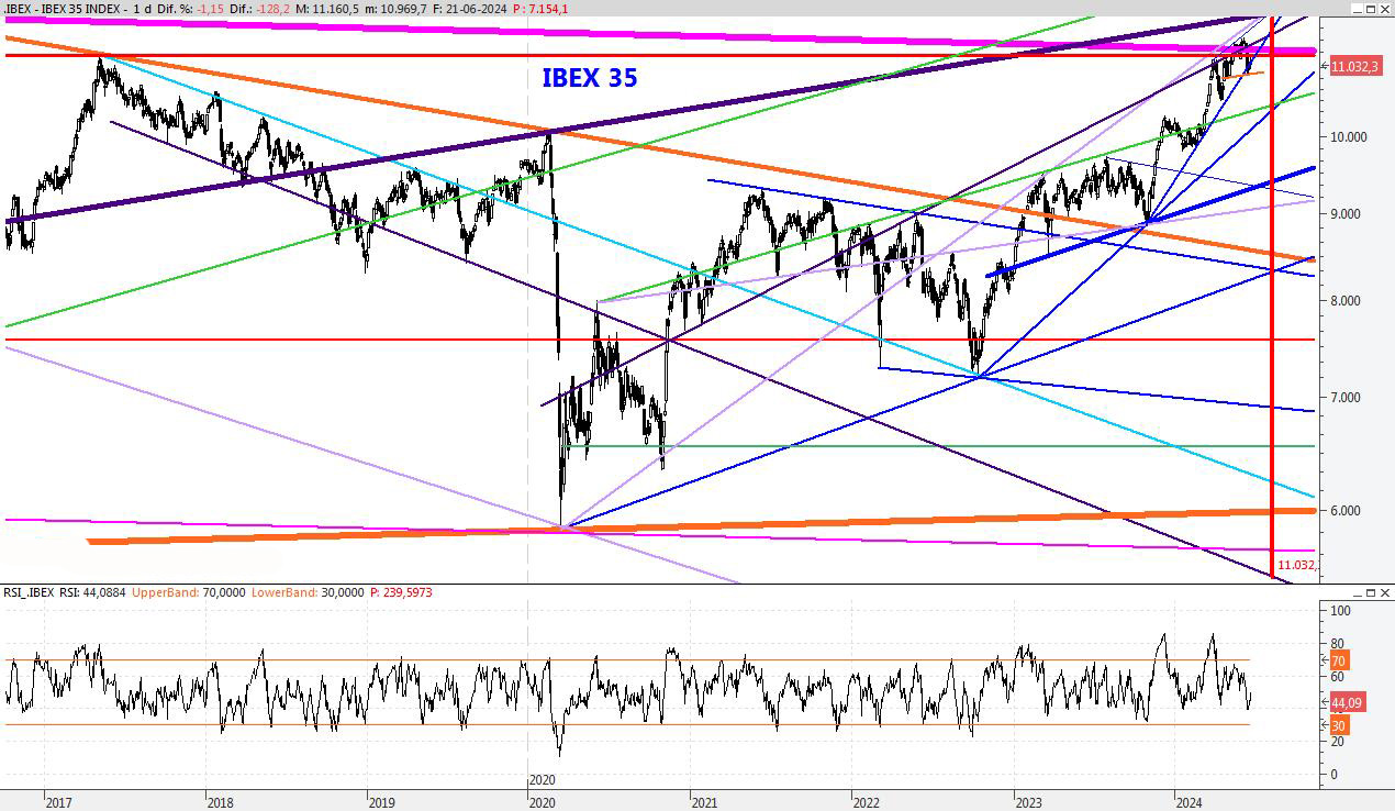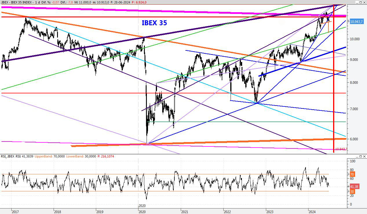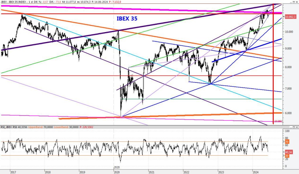 El índice se encuentra en una situación delicada y la pérdida del 10.850 podría traer volatilidad. En los próximos días espero que continúe la incertidumbre. Para la semana que viene el soporte lo mantendría en los 10.500 puntos, con una posible ampliación al entorno del 10.250 en caso de fuerte volatilidad. Por su parte la resistencia la bajaría al 11.287.