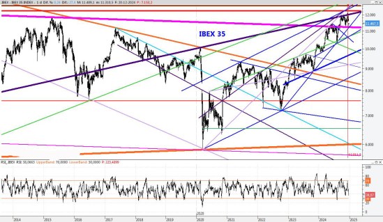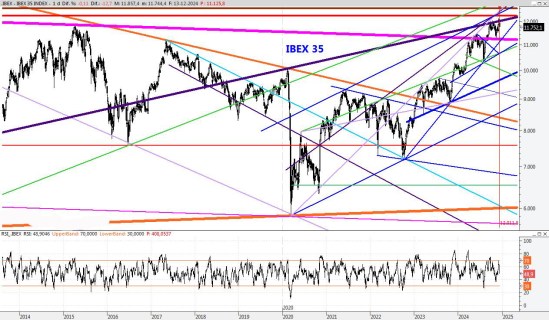 El índice ha conseguido frenar la caída pero necesitaría recuperar el 11.700 para estabilizarse, porque a día de hoy el aspecto del gráfico es de debilidad. Para la semana que viene colocaría la resistencia en los 11.800 puntos, mientras que el soporte lo mantendría en el 10.960.