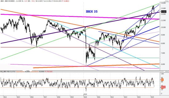 La volatilidad vivida en estas últimas semanas ha sido salvaje. Tras tocar fondo y haber recuperado los niveles de principios de mes, el Ibex tratará de cerrar Abril por encima del 13.250. Eso sería un síntoma alcista que abriría las puertas a nuevas subidas de cara al verano, impulsado por una banca que está eufórica. No obstante, continuamos en un escenario de fuerte volatilidad y todo podría cambiar en poco tiempo. Para la semana que viene subiría la resistencia a los 13.650 puntos, mientras que el soporte lo subiría al 12.550.