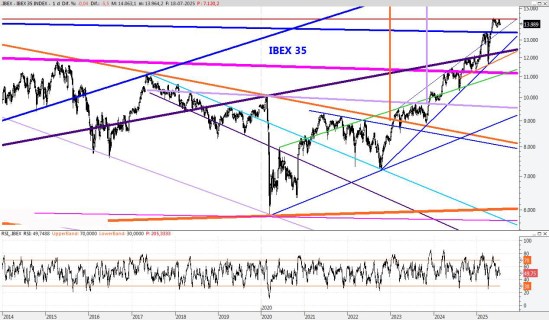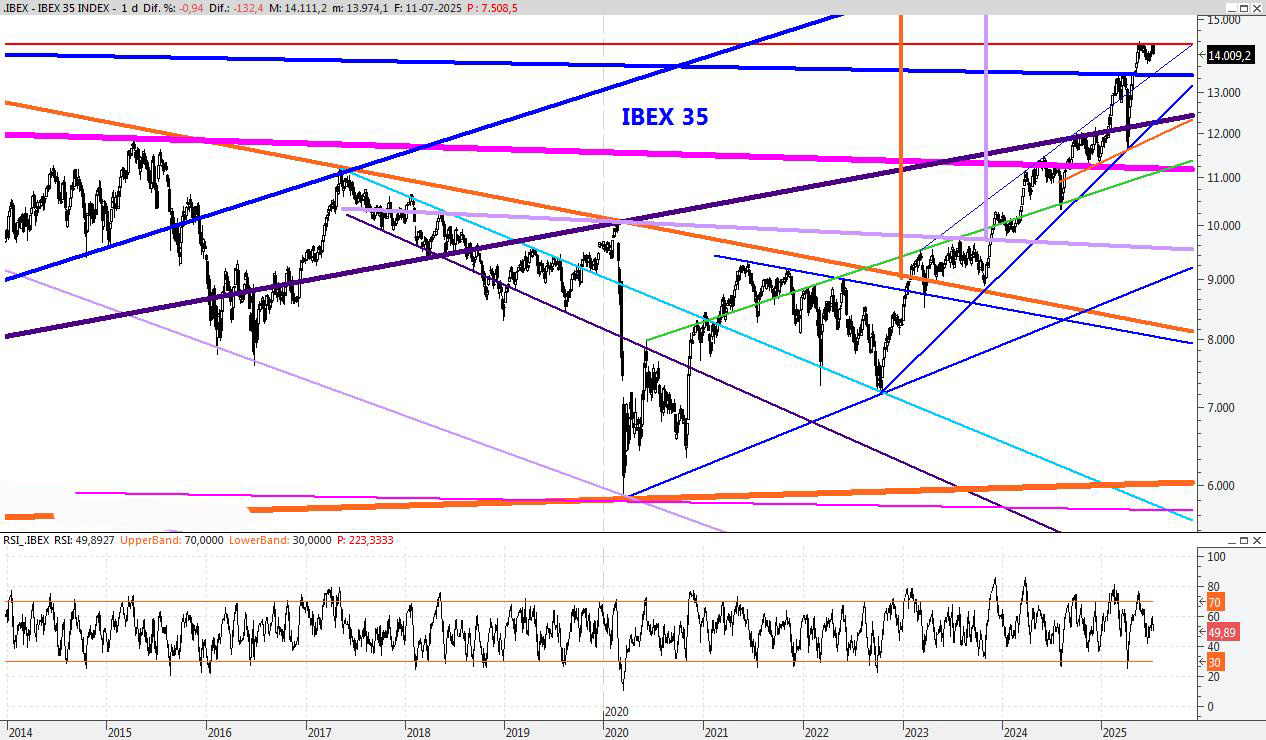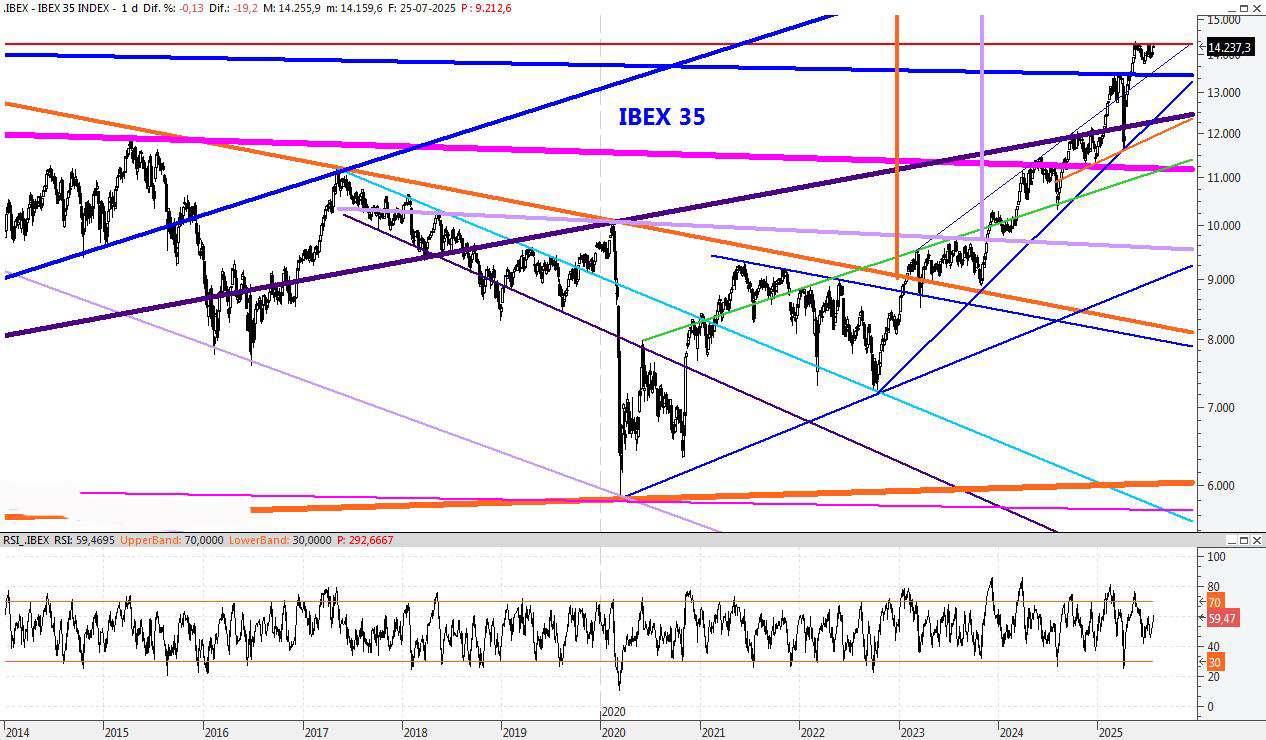 El Ibex regresa a la cima y vuelve a tener una oportunidad de marcar nuevos máximos anuales. La superación del 14.371 podría lanzar al índice a la conquista del 14.800, pero vayamos paso a paso. Para la semana que viene subiría la resistencia a los 14.840 puntos, mientras que el soporte lo mantendría en el 13.737.